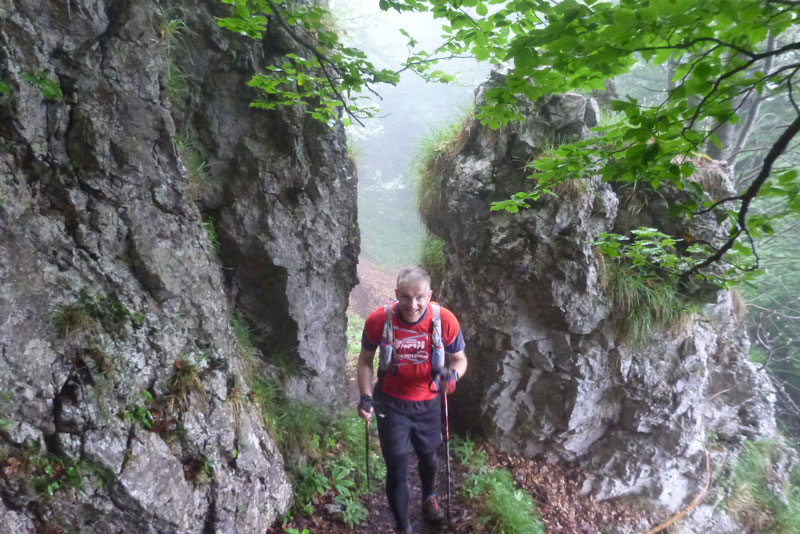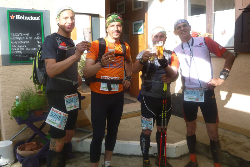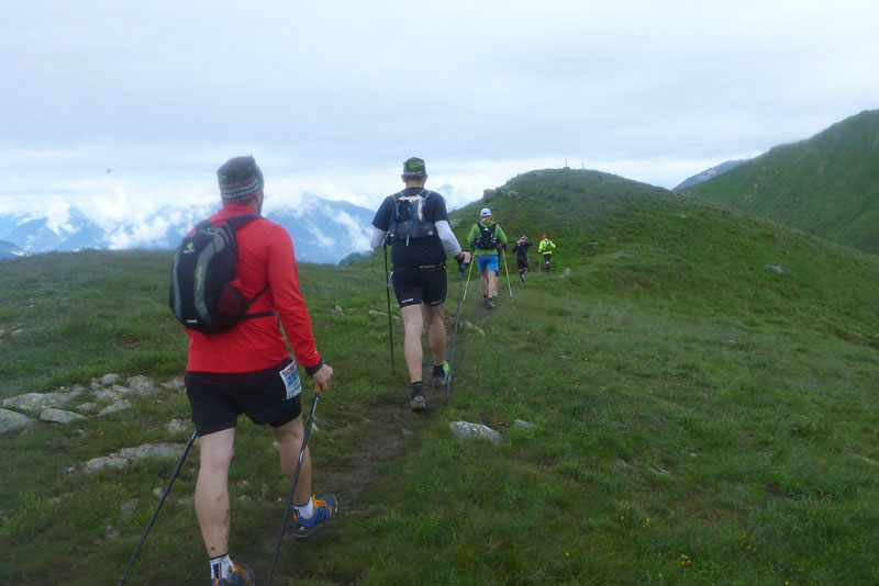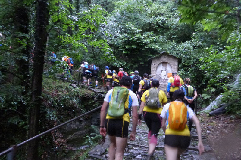 7:45 Uhr. Es hat tatsächlich fast aufgehört zu regnen, nur mehr ein paar Tropfen fallen. Da hat der Veranstalter wohl einer guten Wettervorhersage vertraut. Viele entledigen sich wieder ihrer Regenjacken. Ich traue dem Frieden noch nicht, aber die Folie muss wieder runter. Um 8 Uhr wird pünktlich gestartet: …cinque – quattro – tre – due – uno – Forza! Als Gesamt-Zeitlimit sind 15:15 Stunden vorgegeben. Da also auch einige erst in der Nacht wieder hier eintreffen werden, ist für alle auch eine Stirnlampe vorgeschrieben. Die Liste der Pflichtausrüstung ist lang und in meinen Augen auch sinnvoll. Explizit kontrolliert wurde sie aber nicht, das könnte aber jederzeit auf der Strecke passieren, laut Veranstalterinfo.