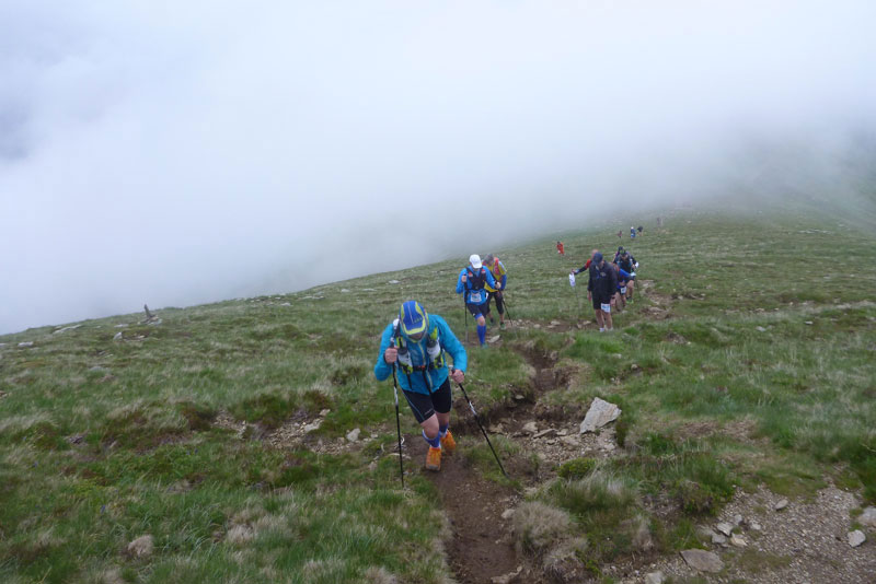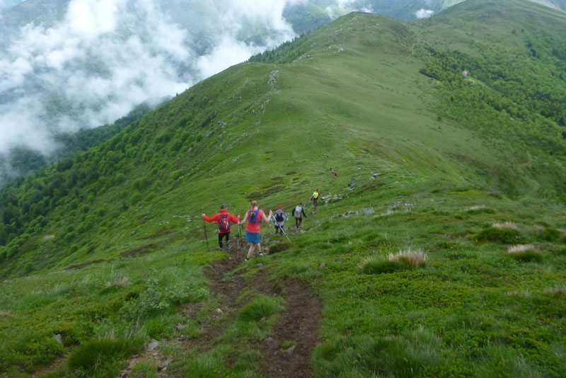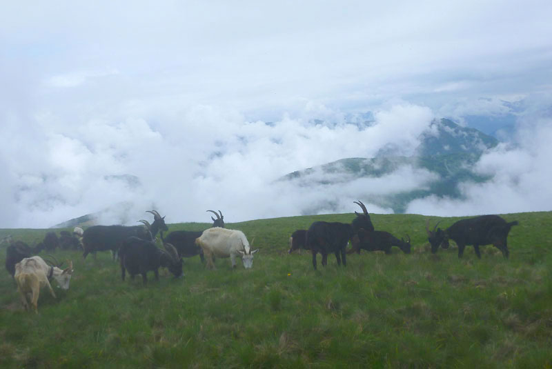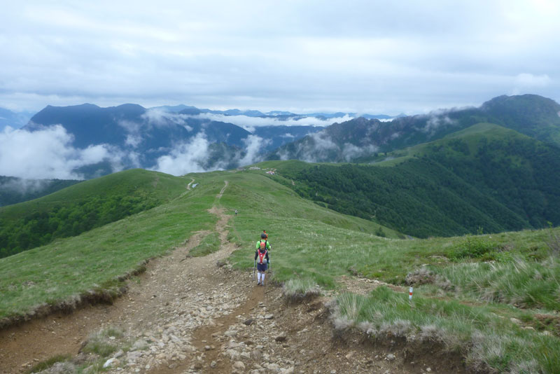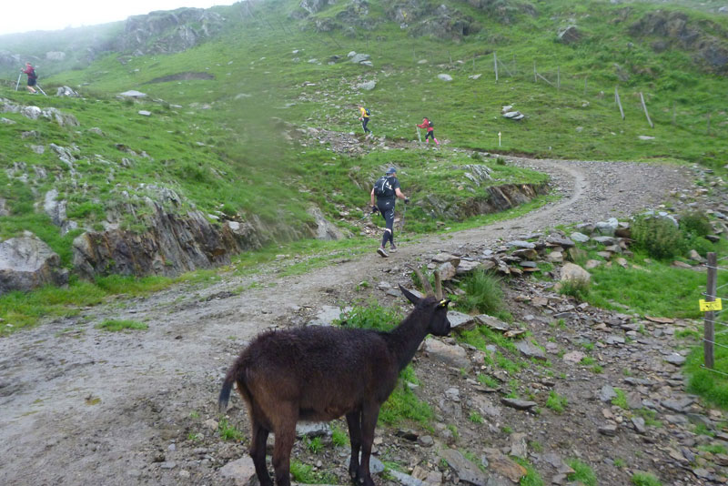 Die nächsten drei Kilometer dienen der Erholung, etwas wellig aber meist leicht bergab führen sie auf gut zu laufenden Wegen, über Wiesen und Pfade zum nächsten langen Anstieg. Ab Gola di Lago geht es zunächst auf einer asphaltierten Straße bis zur Alpe Davrosio. Dem Ziegenbock gefällt so gar nicht, dass ich ihn fotografiere. Lange meckert er mir hinterher. Bis zu unserer ersten Verpflegungsstation gilt es noch 400 Höhenmeter auf 4 km Länge aufzusteigen. Eine Wolkenschicht verschleiert uns zwischendurch die Aussicht gewaltig.