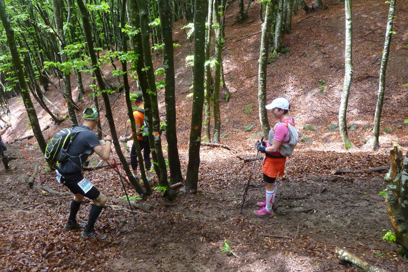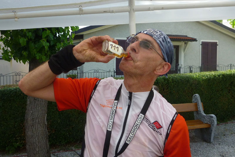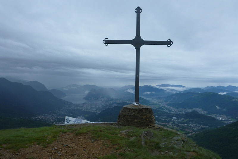 Großartig ist dann aber der Blick vor dem schmiedeeiserenen Kreuz von Motta della Croce (1393 m) hinunter auf Lugano und dem See. Morgen wird hier der Zielbogen des „Vertical della Croce“ stehen. Hundert Meter weiter erreichen wir unsere erste Versorgungsstelle und zugleich nach 12 Kilometern auch ein erstes Zeitlimit. In drei Stunden ist dieser Abschnitt zu bewältigen. Ich habe dringend Stärkung nötig und gönne mir ein paar Minuten Pause. Zeit habe ich genügend und die drei Stunden sind auch problemlos einzuhalten. Das Angebot ist reichhaltig. Von Käse, Kuchen bis zu Obst, Nüssen, Schokolade und Riegeln ist alles zu haben. An Getränken werden Cola, Iso und Wasser angeboten. Wie mittlerweile bei vielen umweltbewussten Trails werden auch hier keine Becher ausgeben, sie gehören zur Pflichtausrüstung.