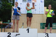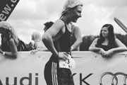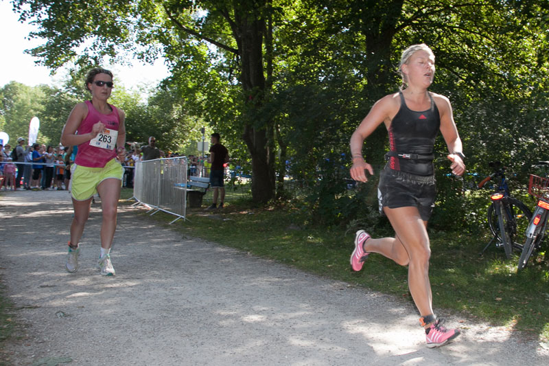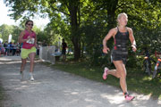 … ich kraulte und fühlte mich wie ein nasser Sack, die Kraft lies nach und ich dachte regelrecht übers Aufgeben nach, was sich im Wasser eher schwierig gestaltet und so fand ich irgendwann einen Rhythmus und rannte keuchend zum Fahrrad. Der Wechsel klappte überragend gut und schnell und ohne eine Ahnung als wievielte Frau ich das Wasser verließ (übrigens 11.) konnte ich im Schnitt von knapp 32 km/h die Radstrecke absolvieren. Als 3. Frau lief ich los, die Beine waren müde, das Laktat überall. Die familiäre Unterstützung und Clays ermunternde Zurufe – nein Schreie „du bist auf Platz 3, ich will dich auf 1 sehen“ verhinderten nicht, dass ich von einer Frau überholt wurde. Allerdings konnte ich schon 100 m später die ehemals Erstplatzierte überholen und nach dem Wendepunkt die nächste Frau hinter mir lassen. Der geplante 4:20er pace war einfach nicht mehr drin und auch die entgegenkommenden Motivationsschreie ließen meine Beine nicht mehr schneller laufen, so dass der Triathlonsieg auf nächstes Jahr verschoben werden muss.