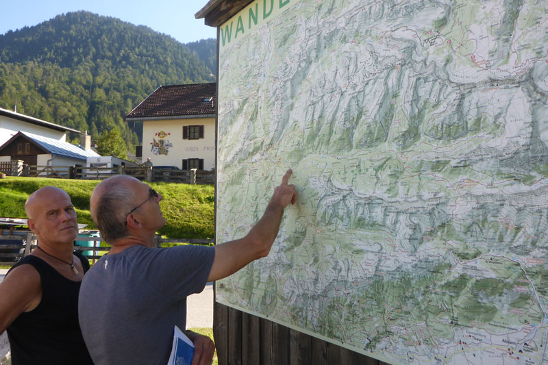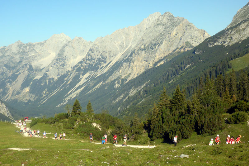 Wir belaufen nun den Adlerweg. Er führt über 24 Etappen und 20.000 Höhenmeter von St. Johann über die Kitzbüheler Alpen, dem Wilden Kaiser und das Karwendel bis ins Lechtal. Wir wollen heute nur einen Teil dieses Weitwanderweges laufen. Erst mal bis zum Kleinen Ahornboden, unsere nächste Verpflegungsstation bei Kilometer 24,2. Wir sind nun auf 1.399 Höhenmeter und ich gönne mir ein paar Becher „Holla“, wie der Tiroler sagt. Holundersaft ist nicht zu süß und schmeckt einfach gut. Auch die Temperatur ist inzwischen deutlich angestiegen, so dass flüssige Nahrung nun unverzichtbar ist.