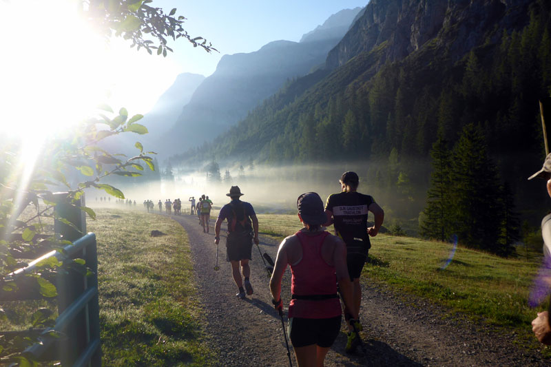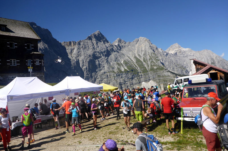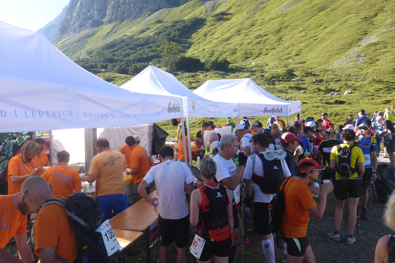 Die Eng Alm wurde zwar erst 1523 in schriftlichen Aufzeichnung erwähnt und wird seitdem auch durchgehend bewirtschaftet, jedoch lassen diverse Funde, wie zum Beispiel ein Bronzeschwert, darauf schließen, das schon sehr viel früher Menschen durch das Tal streiften. Am heutigen Tag prägen die weißen Kunststoffdächer der Verpflegungsstation und der Zielbogen das Bild der Eng. Es geht über ein paar Pfade nach unten und schon ist die Alm erreicht. Viele Läufer und Wanderer tragen bereitss stolz ihre Finisher-Medaille. Bevor ich auf dumme Ideen komme, greife ich einen weiteren Becher Holla und weiter geht's. Noch liegen 17 Kilometer vor mir und wie ich bald erfahre, sind die nicht einfach.