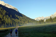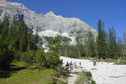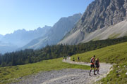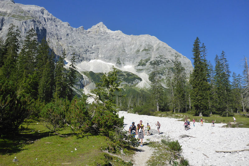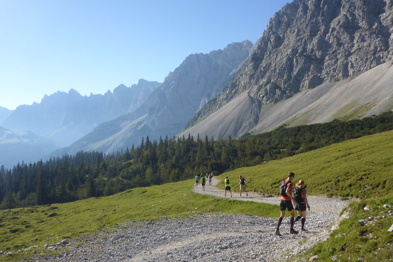 Frisch gestärkt mache ich mich wieder auf den Weg. Erstmals geht's jetzt richtig runter. Auf einem Schotterweg, der noch relativ gut zu laufen ist, verlieren wir auf den nächsten rund sechs Kilometern etwa 500 Höhenmeter. Die Kulisse beeindruckt mich noch immer. Sage und schreibe 125 Gipfel, die über 2.000 Meter hoch sind umgeben uns. Die Birkkarspitze ist mit 2.749 Metern der höchste Gipfel des Karwendelgebirges.