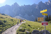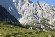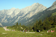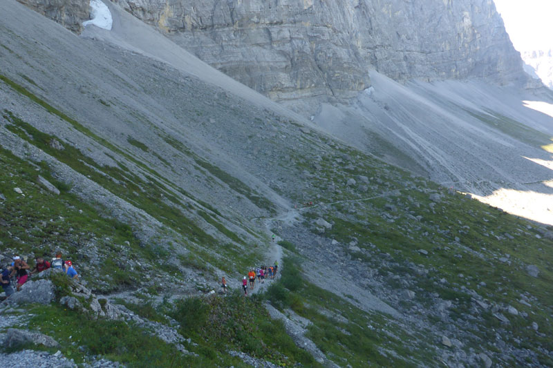 Nur noch fünf Kilometer sind es nun runter zur Eng. Dort ist der Cut-Off-Punkt, den man nach 8:30 Stunden erreichen muss. Ich habe alle Zeit der Welt, muss dennoch feststellen, dass mich inzwischen mehr Marschierer als Läufer umgeben. Mir ist's im Moment erst mal egal. Einige haben sich auch nur die 35 Kilometer bis zur Eng vorgenommen. Das Bild und auch die Beschaffenheit der Stecke ändern sich nun deutlich. Keine satten grünen Wiesen und Almen mehr, es geht durch Geröll und neben uns türmt sich eine graue Wand auf, die Schatten spendet. Hier heißt es Vorsicht walten lassen. Es ist ein ständiges leichtes Bergauf und Bergab. Die bizarre Landschaft gefällt mir, dennoch bin ich froh, als es wieder grüner wird und von weitem die Eng Alm sehen, das Ziel der 35-Kilometer-Strecke.