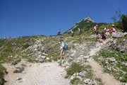 In schier endlosen Schleifen geht es nach oben. Wie Perlen an der Schnur kann ich die Läufer erkennen. Hier ist Stockeinsatz angesagt, die Kamera stecke ich erst mal weg. Der schmale Trail durch Latschenkiefern, über Felsen und Wurzeln ist eine echte Herausforderung, Schatten Fehlanzeige. Der Anstieg wird zur Tortur für mich. Mit kurzen Pausen erreiche ich nach einer gefühlten Ewigkeit endlich den Grameisattel. Völlig platt geselle ich mich oben erst einmal zu den anderen Läufern, die sich nach der Strapaze ebenfalls eine Pause gönnen. Ein paar Mal tief durchatmen und schon kann ich den Ausblick genießen. Ich habe den letzten Anstieg bezwungen. Alles, was jetzt noch kommt, kann nur noch halb so schlimm sein.