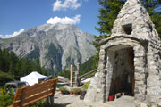 Auf den nächsten fünf Kilometern geht es wieder nach oben. Erst mal durchqueren wir ein ausgetrocknetes Flussbett, was momentan ideal zu den hohen Temperaturen passt. Weiter geht es stetig, aber doch noch sanft nach oben. Schließlich erreichen wir die Ladizalmen. Danach geht es wirklich steil hinauf zum Wegekreuz auf den Kegelboden. In der prallen Sonne ist dies nun schon ganz schön mühsam und ich nutzte die ein oder andere Fotopause, um ordentlich durchzuschnaufen. Am Ende kraxeln wir noch über ein paar schroffe Felsen nach oben und schon liegt die Falkenhütte vor uns. Die Hütte wurde von 1921 bis 1923 durch Adolf Sotier erbaut. Der mit Schindeln bedeckte Holzbaubau steht seit diesem Jahr unter Denkmalschutz. Ich bin aber jetzt erstmal platt und gönne mir nicht nur die nächsten Becher Holla, sondern auch gleich noch eine kurze Pause. Ich bin hier auf 1.848 Metern und genieße im Schatten für ein paar Minuten den Ausblick, bevor es weiter geht.