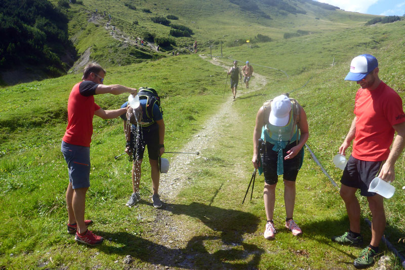 Die Verpflegungsstellen kommen nun in immer kürzeren Abständen. Das nächste Ziel ist die Binsalm. Sie liegt auf 1.502 Metern, was für uns heißt, dass es auf den nächsten drei Kilometern wieder 300 Meter raufgeht. Der Weg ist breit und wenig anspruchsvoll, dennoch komme ich dank der Temperaturen ordentlich ins Schnaufen. Die Binsalm ist ein beliebtes Ausflugsziel für Wanderer und bietet einen herrlichen Ausblick. Neben der Verpflegungsstation ist auch eine Dusche für uns aufgebaut, die reichlich genutzt wird. Erfrischt mache ich mich weiter auf den Weg und kann mich mit den leichten Anstiegen gut anfreunden, bis ein Teilnehmer vor mir stehen bleibt und erschrocken nach links schaut: „Die spinnen doch!“ Ich weiss zunächst nicht, was er meint. Als ich zwischen den Bäumen hindurch den nächsten Anstieg sehen kann, stimmte ich ihm aber zu. Der letzte Anstieg bei Kilometer 40 liegt vor uns und ist aus dieser Perspektive in seiner vollen Pracht und Grausamkeit zu erkennen: Der Gramaisattel auf 1904 m.