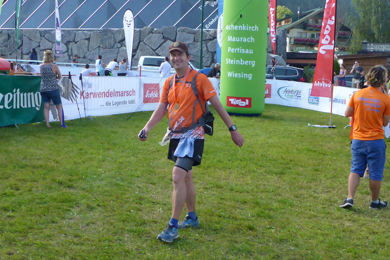 Bernie und Charly nehmen mich gleich in Empfang, doch ich muss mich erst mal eine Runde ins Gras legen. Ich nehme die Glückwünsche zu meinem 50. Finish entgegen und gönne mir darauf ein Erdinger-Alkoholfrei. Nach einer erfrischenden Dusche lassen wir uns mit einem Taxi zurück nach Scharnitz fahren. Ich bin erstaunt, wie lange die Fahrt dauert und schaue immer wieder auf das Karwendelgebirge. Da bin ich durchgelaufen? Ich kann es kaum glauben.