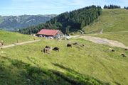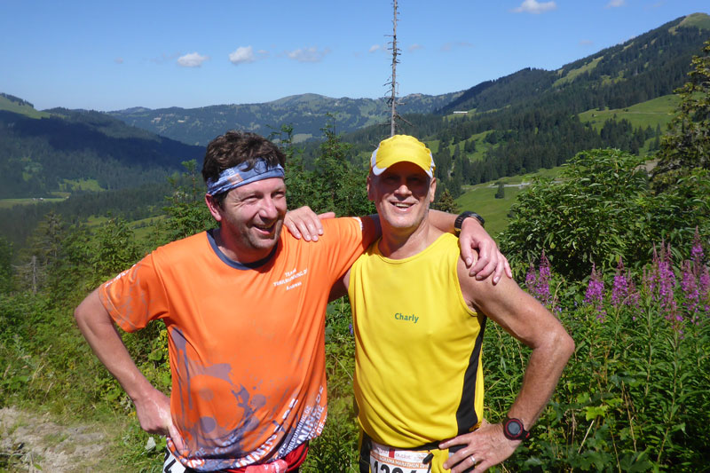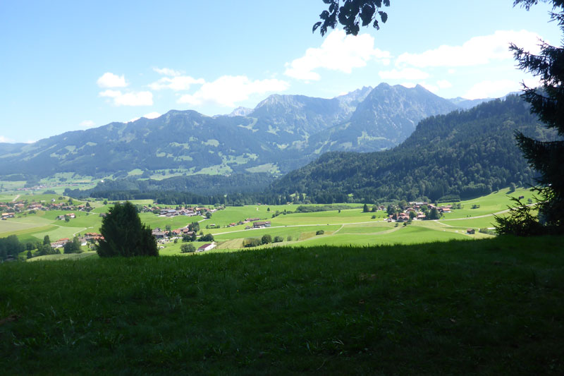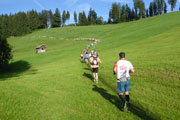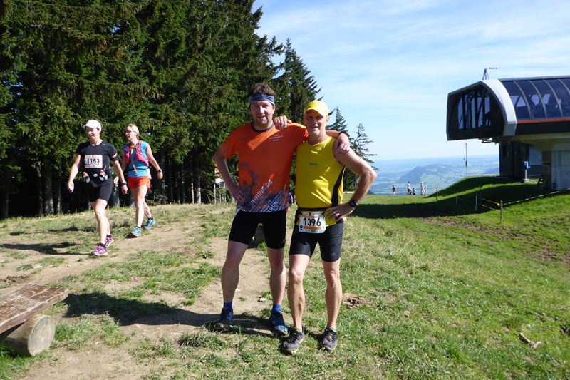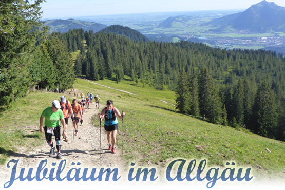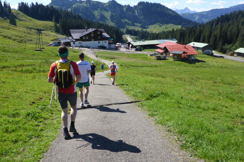 Weiter ging es stetig bergan und ich fühlte mich wirklich gut. Auch Jan schien gut drauf zu sein und war schon bald entschwunden, so dass ich von nun an für mich alleine unterwegs war. So konnte ich mein Tempo selbst wählen, was auch ein Vorteil ist und ich kam gut voran. Die zweite Verpflegungsstelle erreichte ich bei Kilometer 9. Die Weltcup-Hütte Ofterschwang bietet einen grandiosen Ausblick über das Allgäu und ich konnte es bei diesem Wetter auch richtig genießen. Dass ich Charly plötzlich rund einhundert Meter vor mir entdeckte, wunderte mich dann doch etwas. War ich etwa zu schnell unterwegs oder hatte Charly Probleme? Kurz kam mir der Gedanke, dass ich ja auf Charly auflaufen könnte, zügelte mich jedoch und ermahnte mich, bei meinem eigenen Tempo zu bleiben. Es lagen schließlich noch einige Kilo- und Höhenmeter vor uns. Ich teilte mir die nächsten Kilometer schließlich mit einer Läuferin, die erstaunlich warm angezogen war. Lange Laufhose, langes Oberteil und Handschuhe, schienen mir bei diesen Temperaturen etwas übertrieben. Schließlich erklärte sie mir, dass sie an einer Sonnenallergie leide und ihr nichts Anderes übrigbleibe, als so zu laufen. So hätte sich jedoch inzwischen daran gewöhnt und auch bei höheren Temperaturen keine Probleme.