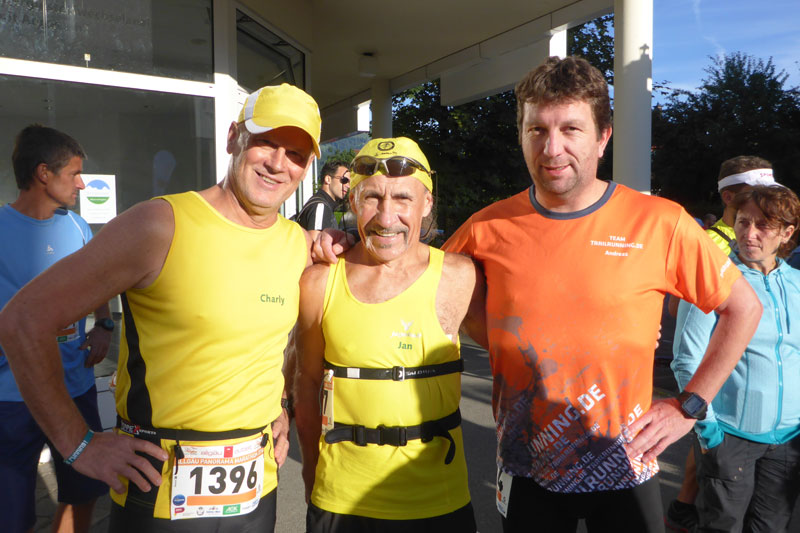 Um sechs Uhr waren ja bereits die Teilnehmer des Ultras gestartet. Die Teilnehmerzahlen können sich auch in diesem Jahr wieder sehen lassen. Exakt 200 Läufer hatten sich auf den Weg gemacht. 362 sollten es beim Marathon und 502 beim Halbmarathon sein. So war, als wir um kurz vor acht Uhr im Startbereich vor dem Allgäu-Outlet standen, einiges los. Die meisten Bekannten waren auf dem APUT unterwegs, so dass ich im Getümmel eigentlich nur meinen marathon4you-Kollegen Markus Pitz ausmachen konnte. Wir wechselten ein paar Worte, bevor wir uns auf den Weg in die Startaufstellung machten.