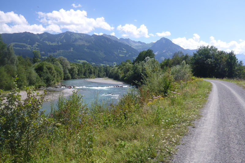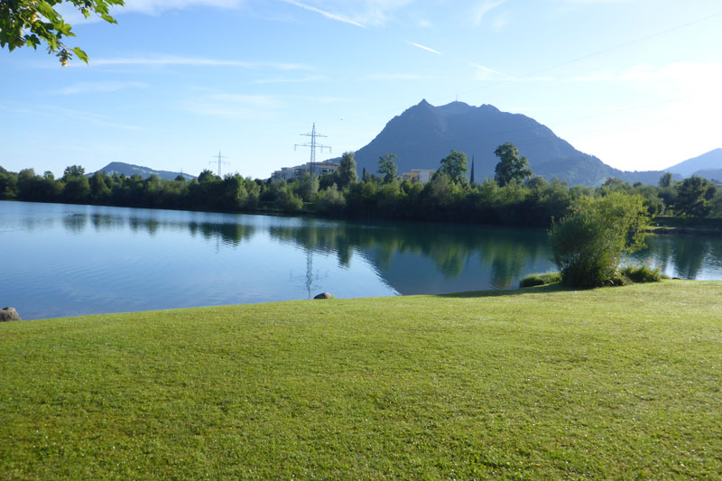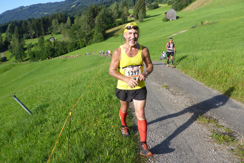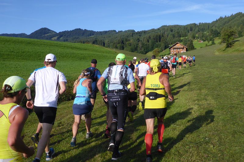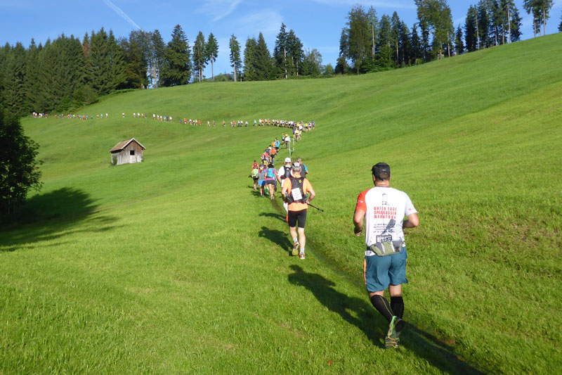 Pünktlich um acht Uhr wurden wir bei strahlendem Sonnenschein auf die Strecke gelassen. Für mich war klar, dass ich den Cut-Off bei Grasgehren bei Kilometer 19 frühzeitig erreichen will, damit ich hinterher genießen kann. Nach sieben Stunden war Zielschluss. So lief ich die ersten beiden zwei Kilometer raus aus Sonthofen zügig an und hielt mich immer im Schatten von Jan. Charly zog erst Mal davon. Nachdem wir den Sonthofer Baggersee passiert hatten, lag der erste lange Anstieg vor uns und das noch dichte Marathonfeld schlängelte sich gehender Weise den Berg hoch. Nach 3,4 Kilometern hatten wir auch schon die erste Verpflegungsstation bei Hüttenberg erreicht und ich griff gleich ordentlich zu, sollten doch auf den kommenden Kilometern noch einige Höhenmeter zu überwinden sein und die Sonne verwöhnte uns auch schon mit Temperaturen von etwa 20 Grad.