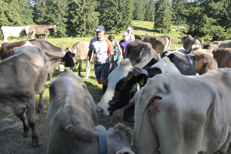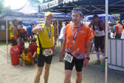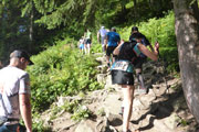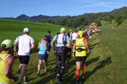 Kurz vor dem Weiherkopf, wo ich doch auf Charly auflief, trennten sich unsere Wege. Charly erklärte mir, dass es total fertig sei und keinen Bock mehr habe. Er dachte sogar über`s Aufhören nach. Ich gab ihm zu verstehen, dass dies keine Option sei, da doch der Cut-Off in Grasgehren schon bald erreicht ist und wir damit das Schwierigste hinter uns hätten. Für die restlichen 23 Kilometer blieben uns über vier Stunden Zeit, das ist zu schaffen. So liefen wir auch nach 2:45 Stunden gemeinsam in Grasgehren ein. Eine halbe Stunde unterhalb des Cut-Offs. Das war absolut in Ordnung und ich gönnte mir an der einzigen Station mit Vollverpflegung ein Butterbrot und reichlich Flüssigkeit. Immer noch fühlte ich mich gut, obwohl die Temperaturen nun schon über 25 Grad lagen. |