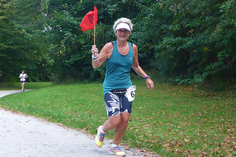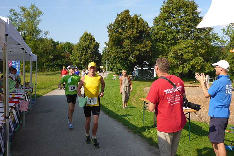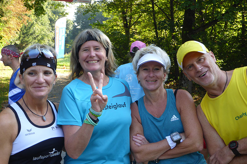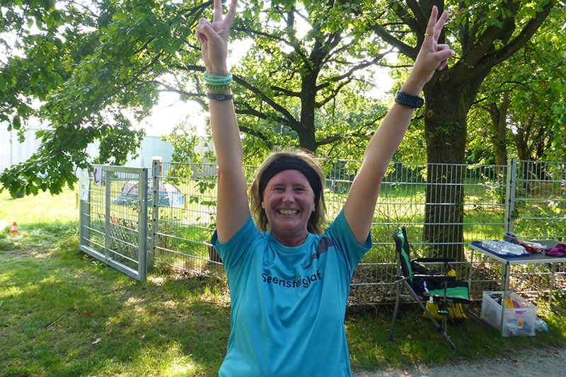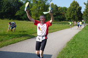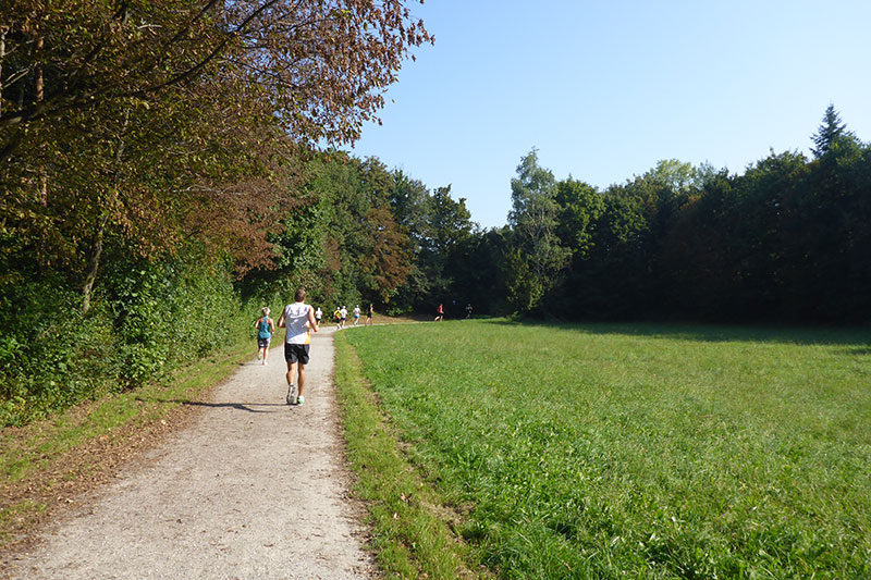 Über die Strecke kann man wirklich nicht viel erzählen, da es im Prinzip ja immer nur im Kreis geht. Abwechselnd durch schattige Waldwege und manchmal halt leider auch in der Sonne. Die Strecke führt nahezu ausnahmslos über gut gefestigte Wege, auf Teer wird nur kurz im Zielbereich gelaufen. Ich gehe die erste Runde gemäßigt an, ich will ja schließlich sechs Stunden durchhalten und sortiere mich im Feld ein. Rund 100 Läufer, darunter auch Staffeln, die in Vierer-Teams laufen und sich die Strecke teilen können, wie sie wollen, verteilen sich relativ schnell und ich kann von Anfang an mein eigenes Tempo laufen. Da das Feld am Ende der ersten Runde noch dicht gedrängt ist, muss man mit den Rundenzählern noch keinen Augenkontakt aufnehmen. Da geht der Veranstalter einfach mal davon aus, dass auch wirklich jeder vorbeikommt. |