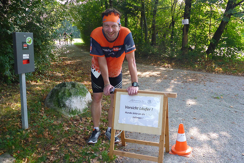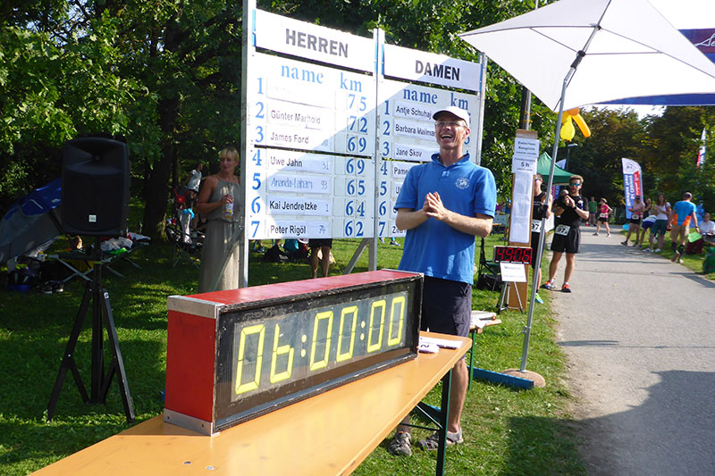 So stehen wir dann am Samstag um kurz nach neun Uhr im Post-Sport-Park und holen unsere Startunterlagen ab. Wichtig ist hierbei auch, dass man mit seinem persönlichen Rundzähler noch vor dem Start Kontakt aufnimmt. Die Runden werden nämlich nicht durch Laufchips und Zeitmatten gezählt, sondern persönlich. Mir wird die Rundenzählerin auf dem Platz „E“ zugewiesen. Durch Augenkontakt nach jeder gelaufenen Runde geht man sicher, dass sie einen nicht übersieht und so eine Runde vergisst. Auch eine gut bestückte Verpflegungsstation ist auf derselben Höhe aufgebaut. An der Strecke gibt es Toiletten und Sanitätsdienste. Es ist also bestens für alles gesorgt, die Organisation stimmt.