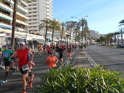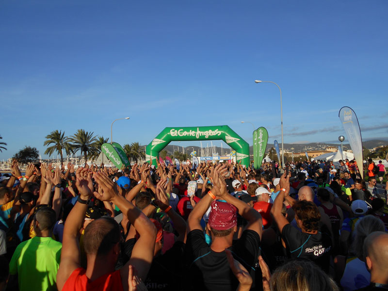 Um ½ 8 werden wir (die Läufer der Grosse Coosmann Laufreise) mit dem Bus zum Start unterhalb der Kathedrale von Palma gefahren. Schnell ist der Kleiderbeutel abgegeben und ich begebe mich mit meiner „Vor-dem-Start-Wasserration“ zum Startbereich. Ca. 10.000 Läufer kündigt der Moderator in deutsch, französisch, englisch und spanisch an. Davon sind ca. 40 % deutsche Läufer/innen dabei. Es werde um 9 Uhr drei Kategorien gestartet. Der Marathon, der Halbe und der 10 Km Lauf. Um 9:10 Uhr werden dann die Walker auf eine 10 km-Runde geschickt. Ganz schön warm ist es bereits auf der sonnendurchfluteten Uferstraße und ich bezweifle jetzt schon, meine gesteckte Zielzeit von 4:15 h erreichen zu können. Aber mal sehen.