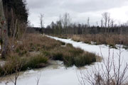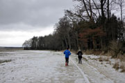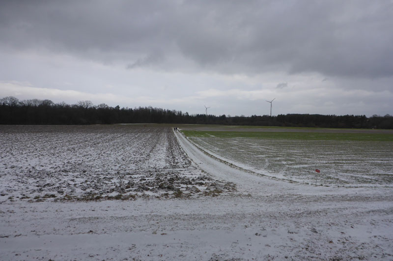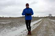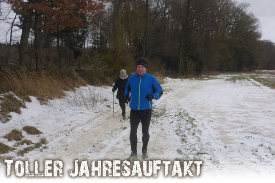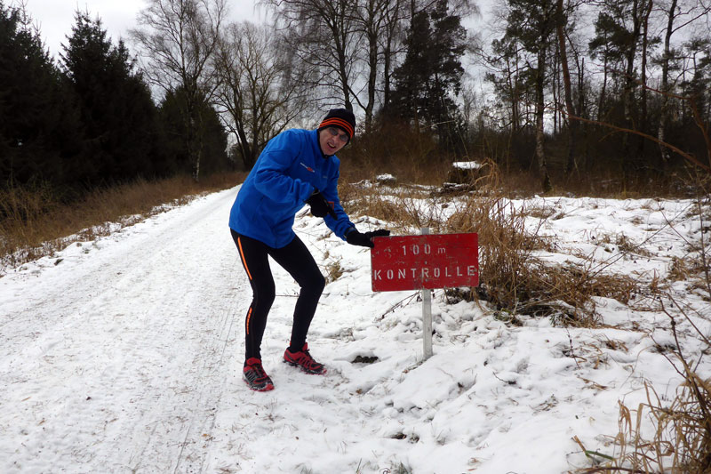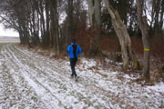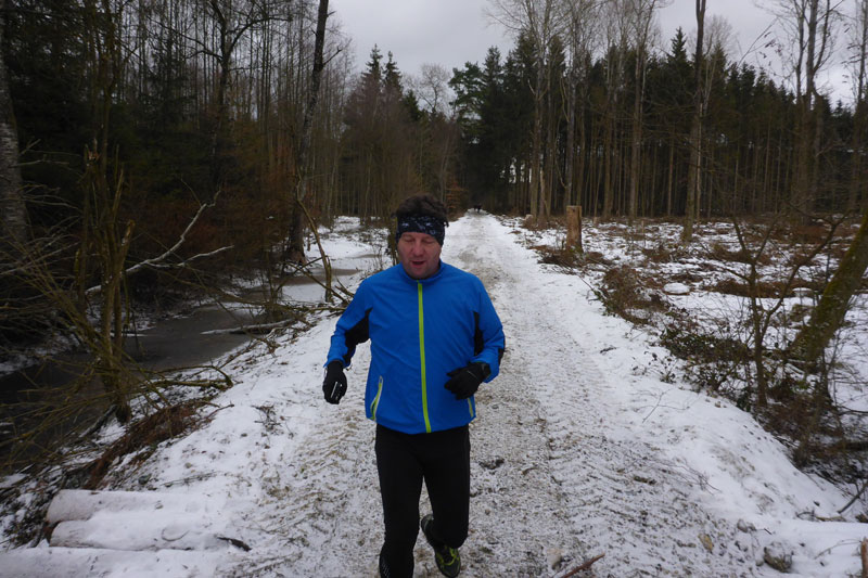 Kurz darauf erreichten wir die Ortschaft Haspelmoor, die wir gleich durchlaufen hatten. Durch die Bahnunterführung wechselten wir nun auf die andere Seite der Bahnlinie Augsburg-München. Es ging wieder raus in die Natur und nach etwa fünf gelaufenen Kilometern erreichten wir die erste Kontrollstelle. Wir sammelten den ersten Stempel auf unserer Starterkarte ein und dafür gab`s einen Becher warmen Tee. Nun teilte sich auch die Strecke und die meisten Wanderer bogen auf die 10-Kilometer-Strecke ab, während Bernie und ich geradeaus auf der Halbmarathonstrecke weiterliefen.