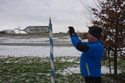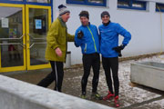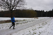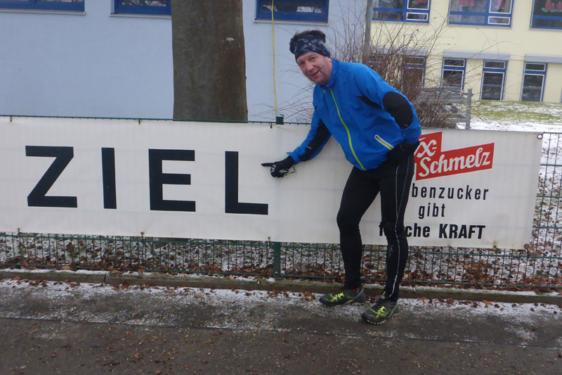 Nun geht es entlang der Bahnlinie auf dem direkten Weg zurück nach Hattenhofen. Doch die letzten vier Kilometer werden für Bernie und mich wahrlich kein Zuckerschlecken. Der eisige Wind hat noch ein paar Stundenkilometer draufgelegt und zudem geht es stetig leicht bergan, so dass wir beide zu kämpfen haben. Doch wir halten unseren Schnitt und kommen wirklich gut voran, die Gespräche sind inzwischen allerdings verebbt. Wir brauchen unsere Luft zum Laufen und so erreichen wir schließlich auch wieder Hattenhofen. Von der Ortsmitte geht`s nun nur noch bergab bis zur Sporthalle, wo wir das Ziel erreicht haben. In der Turnhalle holen wir unseren letzten Stempel auf der Starterkarte und diese verschwindet gleich darauf in einer Pappschachtel zu den anderen Starterkarten. In der Turnhalle ist aufgetischt und wir überlegten noch kurz, ob wir uns eine kleine Brotzeit genehmigen wollen. Da wir nun aber doch etwas durchgefroren waren, entschieden wir uns doch für den direkten Heimweg.