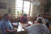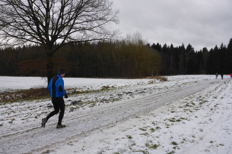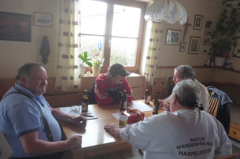Weiter ging es über Feldwege und Wiesen, so dass nun definitiv keine Orientierung mehr möglich war. Bernie und ich hatten oft mit dem eisigen Untergrund zu kämpfen und so mancher Sturz konnte nur knapp vermieden werden. Auf eine Verpflegungsstation freuten wir uns schon ganz besonders. Und zwar auf das „Wohnzimmer“. Peter Eckstein sitzt wie schon im vergangenen Jahr mit ein paar Kumpels im Wohnzimmer und unterbrechen ihre Schafkopf-Runde gerne, um uns den nächsten Stempel auf die Starterkarte zu drücken. „Wollt`s an Kaffee oder vielleicht a Buttabrezen?“, frägt Peter, doch wir lehnen ab und vertrösten ihn auf den Marathon im kommenden Jahr. Da haben wir vielleicht wieder Verwendung für seine Verpflegung, aber heute wollen wir gleich wieder weiter.