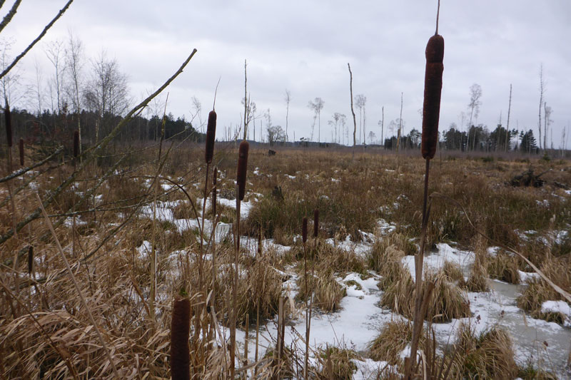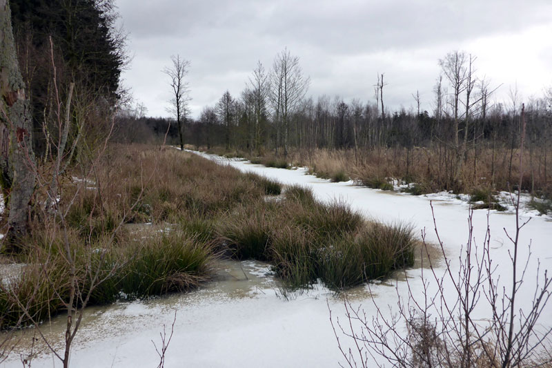 Aufgrund der winterlichen Temperaturen hatten wir uns warm eingepackt und trabten gemeinsam an der Turnhalle in Hattenhofen los. Die Ortschaft selbst hatten wir schon nach wenigen hundert Metern verlassen und auf einem Feldweg ging es in Richtung Wald und Haspelmoor. Der Wind pfiff eisig und so dauerte es eine Zeitlang bis es uns warm wurde. Auf dem Feldweg erkannten wir auch gleich die Tücken der eisigen Temperaturen. Es war glatt und trotz unserer Trailschuhe kamen wir hier und da ins Rutschen. Schon bald hatten wir das Haspelmoor selbst erreicht, das aufgrund seiner bizarren Landschaft begeistert. In eine dünne Schneedecke gehüllt war es in diesem Jahr gleich noch ein Stück schöner und wir legten einen ersten Fotostopp ein.