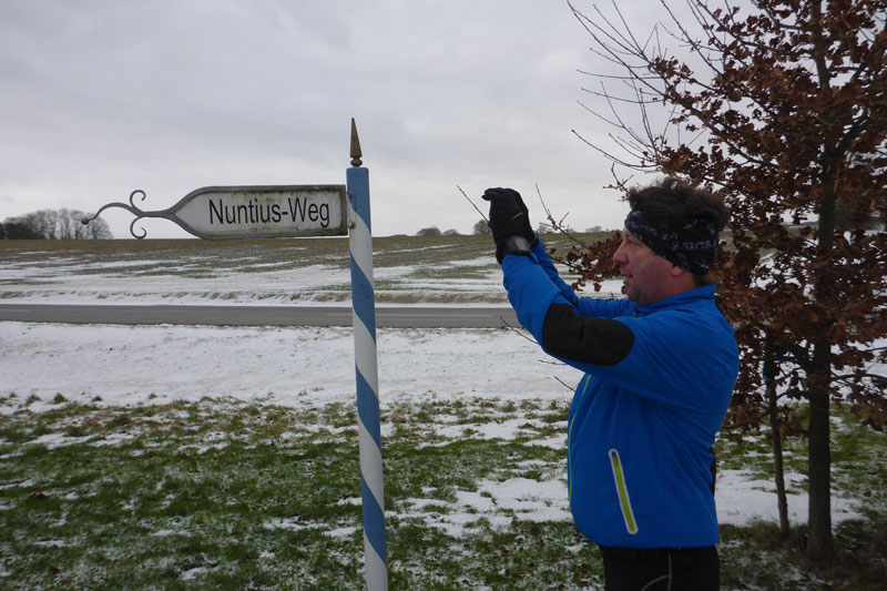 Teilweise erkannten wir Streckenabschnitte aus dem Marathon des Vorjahrs wieder, manchmal waren sie aber völlig neu und wir verloren auch hier und da die Orientierung. Aber die Strecke war stets gut ausgeschildert, so dass wir zu keiner Zeit Gefahr liefen uns zu verlaufen. Wir durchliefen Nassenhausen und waren sehr gespannt auf den weiteren Streckenverlauf. Am Ende von Nassenhausen bogen wir links auf einen Feldweg ein und ein Hinweisschild erklärte uns nun, dass wir uns auf dem „Nuntius-Weg“ befinden. Den Weg zierten am Wegesrand Gedenksteine und -tafeln, die uns schließlich auch darüber Aufschluss gaben, was es mit dem Nuntius-Weg auf sich hat. Am 29. April 1925 war Nuntius Pacelli, der spätere Papst Pius XII bei der Gruftbeisetzung des Prälat Martin Hartl in Nassenhausen. Er pflegte eine lange Freundschaft mit den Erbauern der Nassenhausener Kirche.