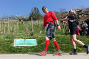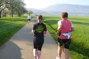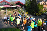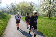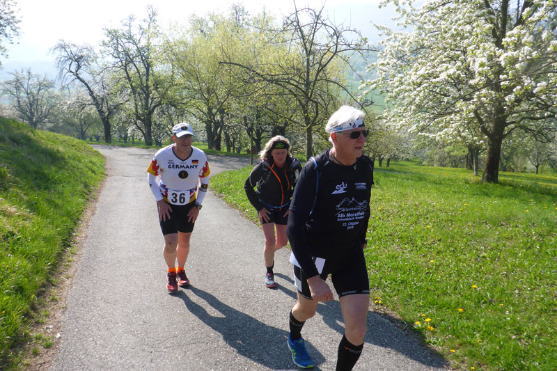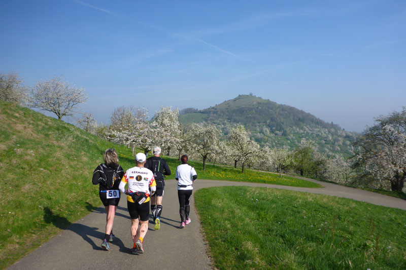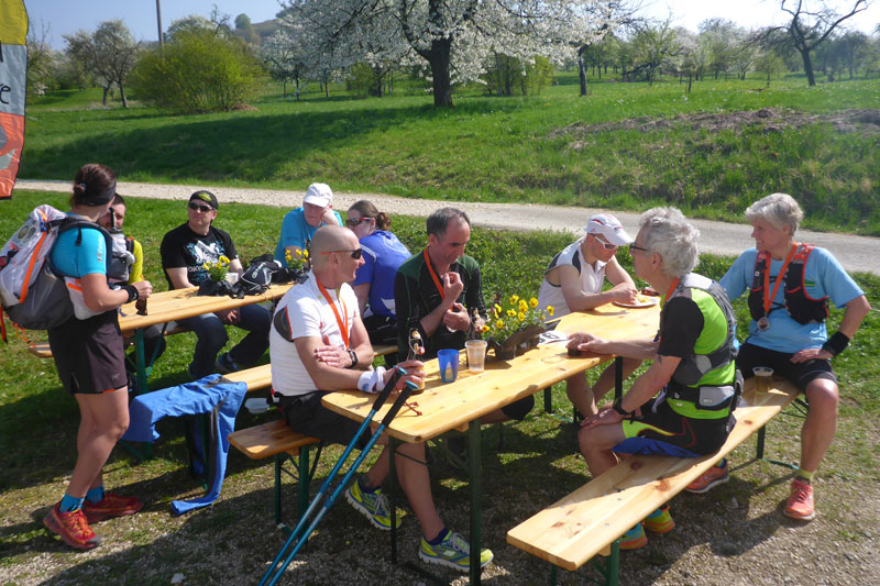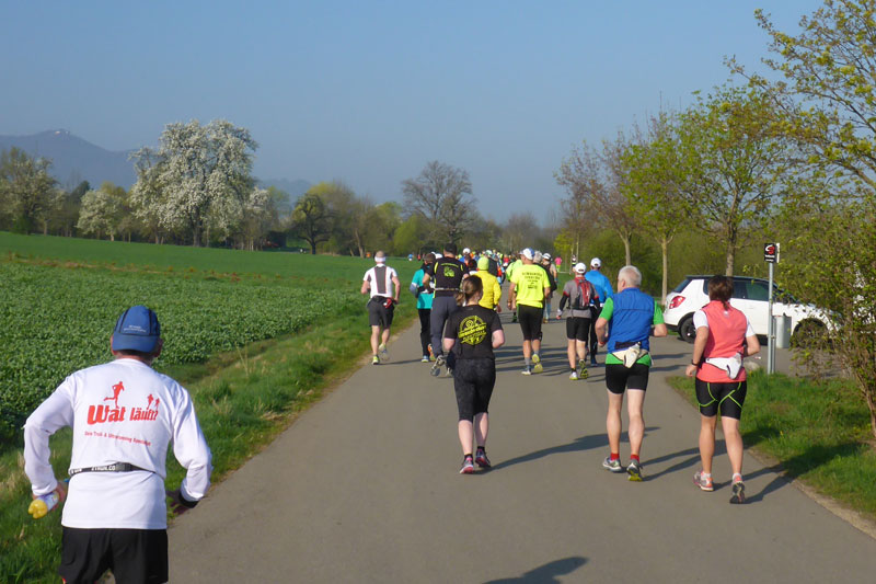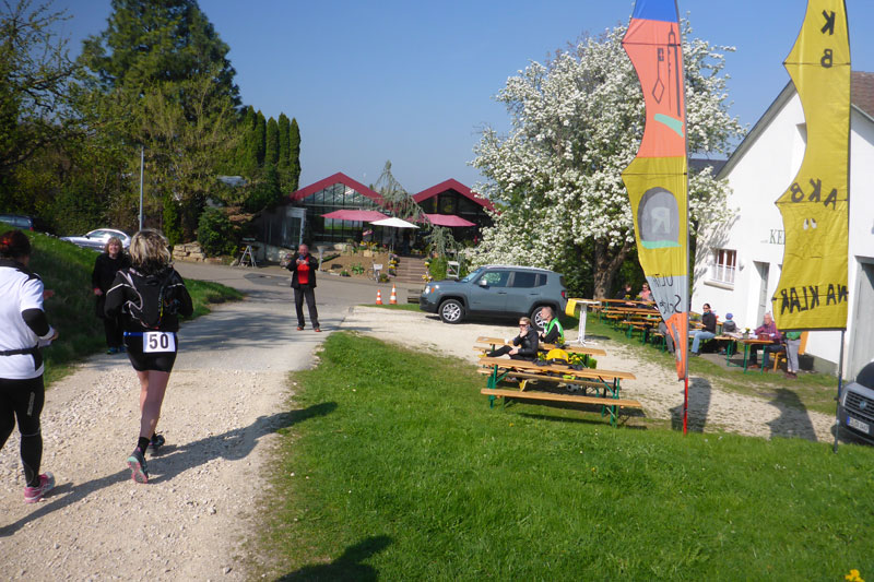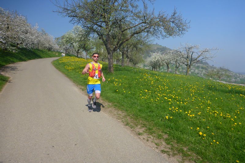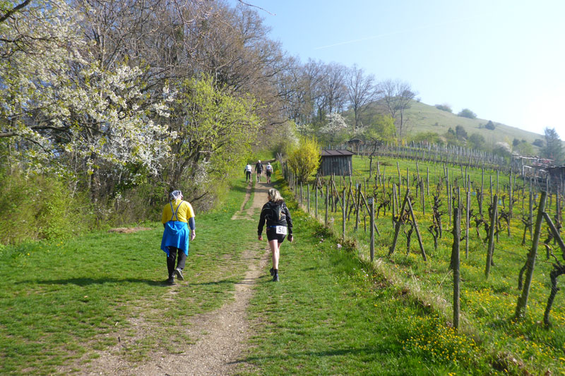 Nach einem Geburtstagsständchen und einer kurzen Ansprach von Conny und dem 3. Bürgermeister der Stadt geht es nahezu pünktlich um 9 Uhr los. Mit 5 Grad ist es noch etwas frisch, aber wir können ja nach jeder Runde ablegen. Die ersten 200 Meter führen auf der Weinsteige leicht bergab, nach einer Linksbiege verlassen wir den Ort und sind schon im Grünen. Ich befinde mich schnell am Ende des Feldes …noch hinter Gerhard. Nach über 6 Wochen Verletzungspause mit einigen Rückschlägen weiß ich gar nicht was heute machbar ist und gehe die Sache lieber etwas vorsichtiger an.