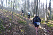 500 Meter weiter biegen wir in die Alte Bissinger Straße ein. Nicht dramatisch aber doch etwas spürbar geht es auf Asphalt immer leicht aufwärts. Nach drei Kilometern tauchen wir in einen etwa einen Kilometer langen Waldabschnitt ein, wo es 100 Höhenmeter aufzusteigen gilt. Vom Hangfuß führt uns ein rustikaler Trailabschnitt auf den Höhenrücken Braunfirst. Ein paar matschige Stellen sind dabei, wo ich froh bin Trailschuhe gewählt zu haben. Steinzeitliche Funde auf dem Braunfirst belegen dass vor mehreren tausend Jahren bereits einige vor uns hier durchzogen.