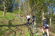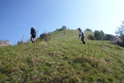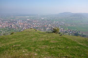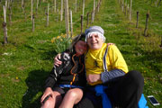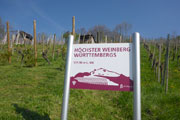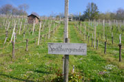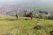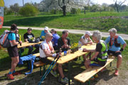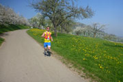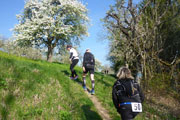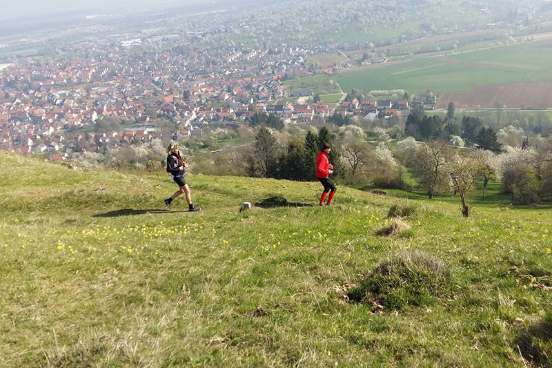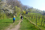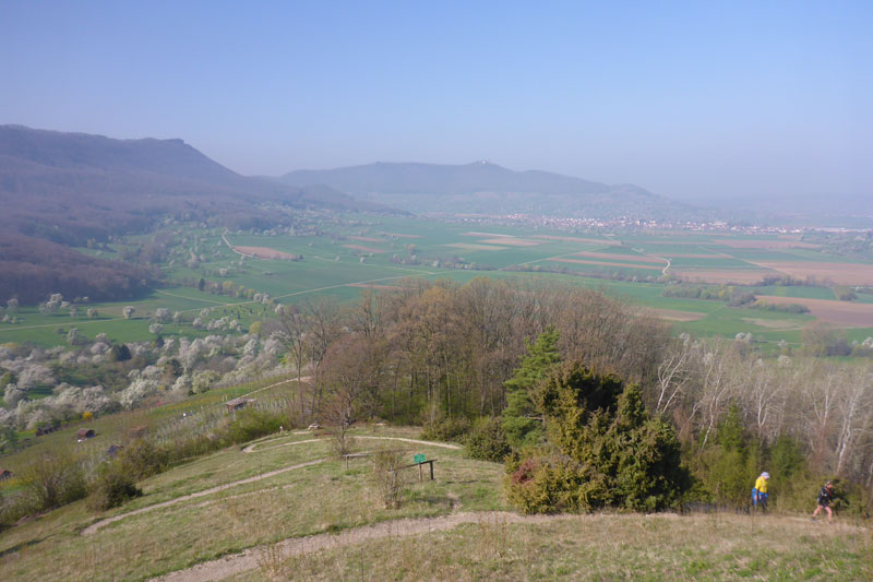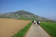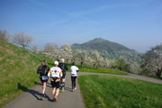 Mittlerweile haben wir uns zu einer kleinen Gruppe gefunden und Conny erzählt uns was über ihre Heimat. Tausende von Obstbäumen verwandeln die Landschaft in ein weißes Blütenmeer. Mit ihren 18.000 Kirschbäumen zählt die Gegend zu den größten Kirschanbaugebieten in Deutschland. In langgezogenen Serpentinen geht es durch Streuobstwiesen abwärts bis an den Fuß der Limburg. Der Kurs ist hervorragend mit blauen Pfeilen auf den Wegen markiert, da gibt’s kein Verlaufen. |