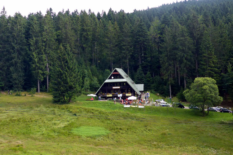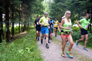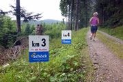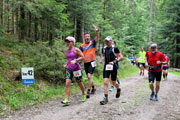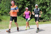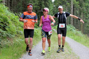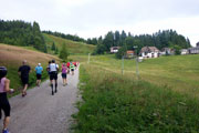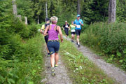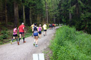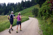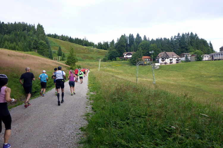 Schließlich naht der Start und wir finden uns vor dem Startbogen unterhalb der Skihütte ein. Außer den wirklich schnellen Läufern scheint sich aber keiner nach ganz vorne zu trauen und so werden wir alle aufgefordert, doch etwas enger zusammenzurücken. Zaghaft kommt das Feld dieser Aufforderung nach und schon geht es los. Rund einen Kilometer Anlauf haben wir, bis wir auf den eigentlichen Rundkurs kommen. Erst mal geht es leicht bergab, dann auf einer langen Geraden stetig bergan. Vom grasgrünen Skihang aus können wir rechts zur Skihütte schauen. Dort wird in ein paar Stunden unser Ziel liegen. Doch soweit denke ich noch gar nicht. Ich bin gespannt was uns erwartet, sortiere mich im Feld ein und versuche den Kontakt mit Kati und Jochen zu halten. Wir sind schließlich auf Höhe des Parkplatzes direkt an der Schwarzwaldhochstraße angekommen und werden nun nach links in den Wald geschickt, der nun unser Laufrevier ist. Der Hornisgrinde Marathon rühmt sich ja, der waldreichste zumindest in Deutschlands zu sein. Auf breiten, gut zu laufenden Forstwegen geht es nun immer leicht ansteigend voran. Das Feld zieht sich zügig auseinander, so dass Kati, Jochen und ich bequem nebeneinander herlaufen und ratschen können. |