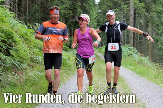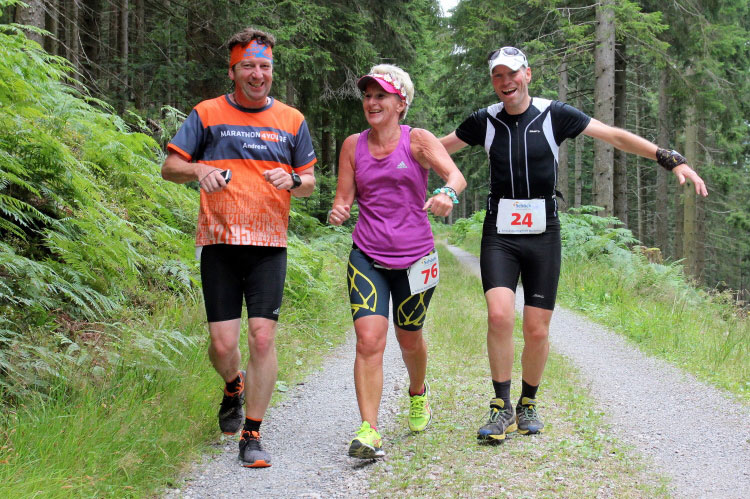 Eine Viertelstunde vor dem Marathon werden die Läufer des 11-Kilometer-Laufs und die Nordic Walker auf die Strecke geschickt. Das Feld an Marathonis ist übersichtlich. Wir sind 85 Starter. Die Zahlen waren hier schon mal besser. Aber wie überall tun sich die abgelegenen Landschaftsmarathons schwer. Eine Gegenmaßnahme war es mit Sicherheit nicht, als man sich im letzten Jahr aus organisatorischen Gründen auch noch von dem attraktiven Ein-Runden-Kurs verabschiedet hat und seither den Marathon auf vier Runden läuft. Ich bin da völlig unbedarft, da ich die alte Strecke ja nicht kenne und freue mich auf das, was vor mir liegt. Die Landschaft hier ist herrlich und wenn die Runde schön ist, laufe ich sie auch gerne viermal – zumal die Strecke auch noch ausschließlich im Wald verläuft. Mit rund 500 Höhenmetern, die laut Ausschreibung insgesamt zu absolvieren sind, hört sich die Sache nicht allzu einfach an.