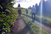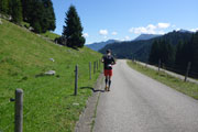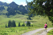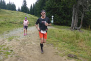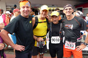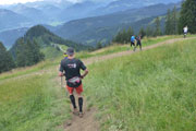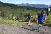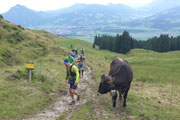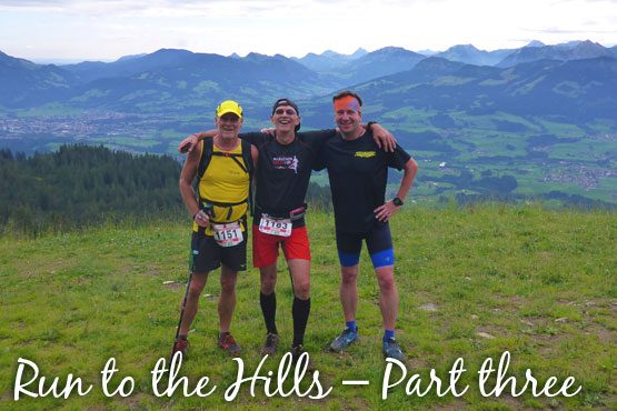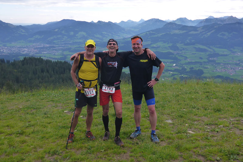 Der weitere Weg bis zum Weiherkopf ist einfach nur Allgäu zum Genießen. Anstiege, Bergab-Passagen, Trails. Es ist einfach nur schön und wenn es nicht gerade bergauf geht, lasse ich es richtig laufen. Der steile Anstieg zum Weiherkopf kostet nun zwar doch ziemlich Kraft und ich erreiche ihn zeitgleich mit Bernie. Wir drücken einem Teilnehmer meine Kamera in die Hand und er macht selbstverständlich ein Foto mit der tollen Kulisse im Hintergrund. Doch da naht auch schon Charly und wir warten noch kurz, damit wir schließlich auch alle drei auf`s Bild kommen. |