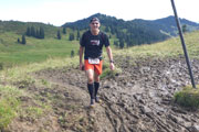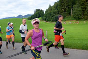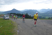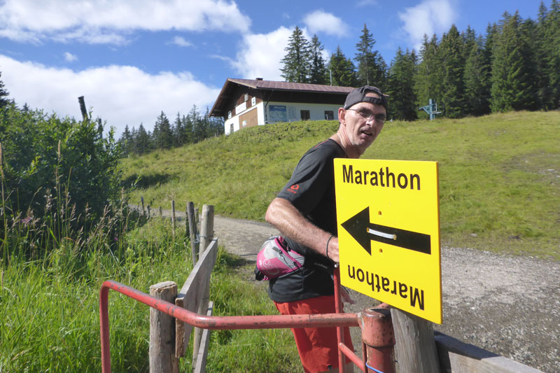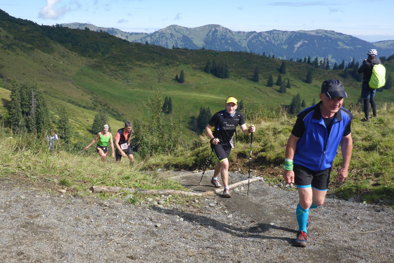 So schloss ich immer näher auf Bernie auf und konnte ihn auch irgendwann einholen. Charly habe ich irgendwann unbewusst überholt und so erreichte ich schließlich gemeinsam mit Bernie die Weltcup Hütte Ofterschwang. 7,8 Kilometer hatten wir inzwischen in den Füßen und ich fühlte mich immer noch unglaublich gut. Bei meinen vorrangegangenen Teilnahmen war ich an dieser Stelle schon manchmal ziemlich platt. Aber heute fühlte ich mich einfach gut. Bernie erkannte meine Leistung bis dahin auch gleich lobend an. „Was es doch ausmacht, wenn einen die Presse als Bergläufer bezeichnet!“, witzelte er. Für mich eine weitere Motivation einfach so weiterzulaufen.