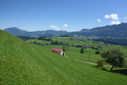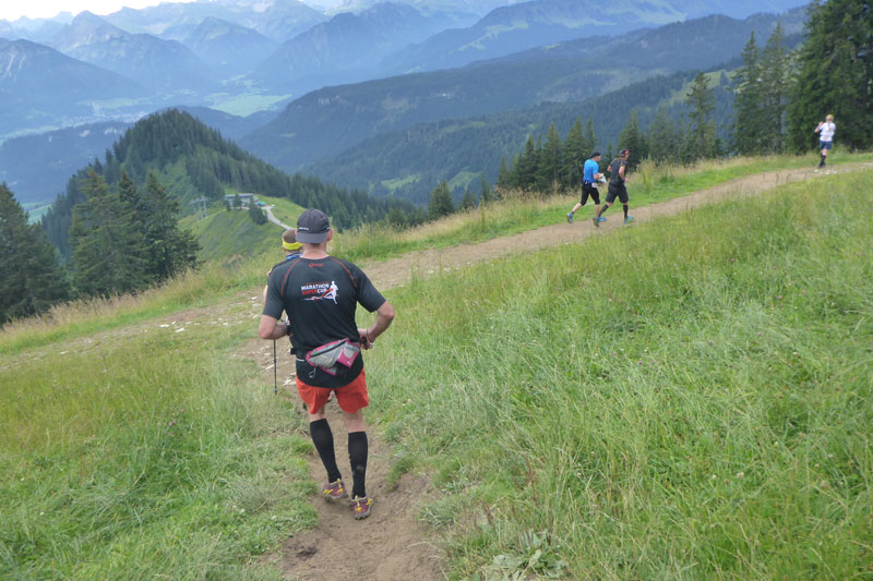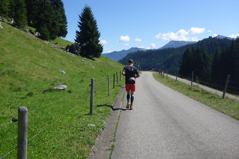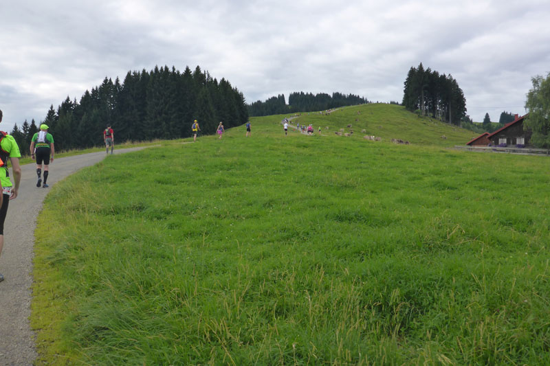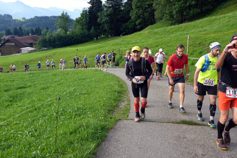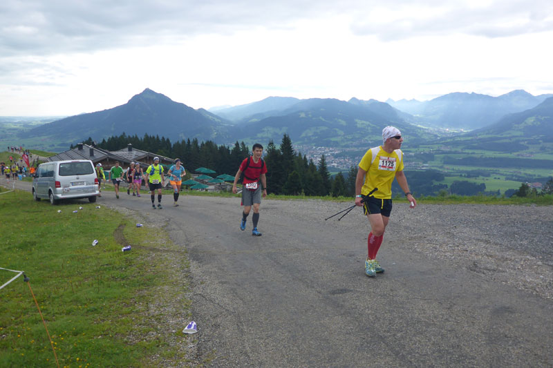 Die ersten drei Kilometer sind flach und dienen erst mal dem Einrollen und Warmwerden. Ich hielt mich ständig in der Nähe von Bernie und Janosch auf, das Tempo kam mir richtig vor. Nur Charly entschwand auf der Ebene erwartungsgemäß relativ schnell. Nach einem ersten Vorgeschmack und den ersten paar Höhenmetern erreichten wir nach 3,4 Kilometern Hüttenberg, wo die erste Verpflegungsstation aufgebaut war. Ich schnappte mir einen Becher Iso und stärkte mich für den ersten langen Anstieg. Stetig ging es nun nach oben und der Blick zurück nach Sonthofen wurde immer schöner. Das gesamte Allgäuer Alpenpanorama tat sich vor uns auf und erste Sonnenstrahlen waren durch die Wolkendecke zu erkennen. Für mich schon fast der schönste Teil am Marathon.