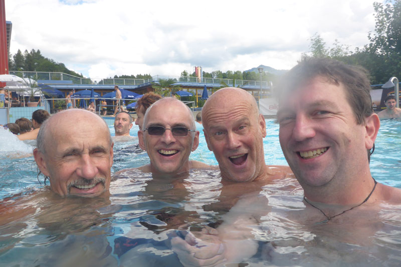 So vergeht die Fahrt wie im Flug und bald parken wir vor dem Allgäu Outlet in Sonthofen ein. Wir holen schnell unsere Startunterlagen und verlegen dann zum Wonnemar, da wir in unmittelbarer Nähe des Ziels parken wollen. Lieber vor dem Start ein paar Meter mehr gegangen als hinterher. Rund eine dreiviertel Stunde vor dem Start machten wir uns dann auf den Weg zurück zum Outlet, wo um acht Uhr gestartet werden sollte. Gegenüber dem Outlet gibt es eine Bäckerei und wir wollten uns noch einen Kaffee gönnen. Lediglich Charly hatte Geld dabei. Bei einem möglichen Ausstieg möchte er das für das Taxi zurück nach Sonthofen parat haben. Taxis und Hubschrauber fliegen bzw. fahren hier auf Rechnung kann ich ihm aus Erfahrung mitteilen und so opfert Charly sein Kleingeld für einen Kaffee für alle.