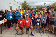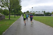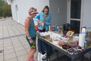Nach einem kurzen Erinnerungsfoto geht es dann los. Jürgen zählt herunter und wir werden auf die Reise geschickt. Kati Schramm und ich wollen den Lauf mal wieder gemeinsam bestreiten und laufen von Beginn an gemeinsam. Die Strecke ist auch schnell beschrieben. Vor dem Eingang der Sporthalle ist Start und Ziel, sowie die gut bestückte Verpflegungsstelle. Danach geht es kurz gerade aus, bevor wir den grünen Teil des Parks erreichen. Wir folgen nun einer langgezogenen Linkskurve, biegen an deren Ende nach links ab, es folgt eine rund einhundert Meter lange Gerade, dann um einen Baum herum wieder nach links und erreichen wieder die Sporthalle. Dort gilt es noch ein kleines „U“ zu durchlaufen und die Runde ist geschafft. Am Ende der ersten Runde sind Kati und ich mit dem Spitzenfeld noch nahezu gleichauf.
