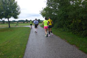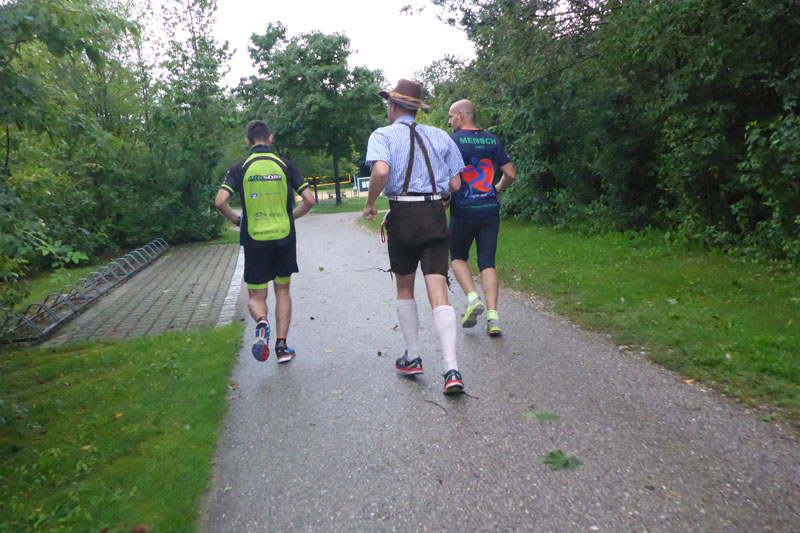 Die Wolken hängen nach dem nächtlichen Gewitter noch immer sehr tief über Taufkirchen und so bekommen wir etwa in der zehnten Runde auch einige Regentropfen ab. Kati und ich überlegen, ob wir uns die Regenjacke anziehen sollen, verzichteten jedoch darauf, da es sonst zu warm werden könnte. Und so trabten wir im Nieselregen weiter unsere Runden. Meine Schmerzen in den Oberschenkeln verschoben sich nun von vorne zu den Oberschenkelseiten hin und auch Kati lief nicht wirklich locker. Notfalls kriechen wir auf allen vieren über die Strecke, witzelten wir und überspielten damit unsere Bedenken, heute auch tatsächlich das Ziel zu erreichen.