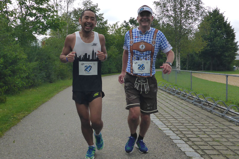 Familiär ist es dann auch am frühen Samstagmorgen an der Startlinie. 37 Teilnehmer sind bereit die Bavarian Challenge 100 unter die Füße zu nehmen. Nicht alle werden und wollten alle 100 Runden im Sportpark laufen. So ist zum Beispiel auch der kleine Owen Lam mit am Start, der wohl der jüngste Teilnehmer gewesen sein dürfte. Ottos Vater ist bereits 77 und ebenfalls mit dabei. Das kleine Teilnehmerfeld wirkt schon von außen sehr international. Ottos Familie lebt in New Jersey, ursprünglich stammen sie jedoch aus Hongkong und sie können ihre asiatische Herkunft nicht verleugnen. Etwa die Hälfte des Feldes stammt somit aus den USA, während der Rest aus Deutschland kommt. Es wird also ein Deutsch-Amerikanisches Lauffest. Zwei Teilnehmer sind sogar extra deswegen von New Jersey nach Deutschland geflogen, erzählt mir Jürgen noch vor dem Start.