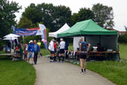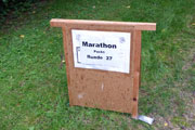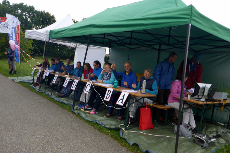 Rund eine viertel Stunde vor dem Start wird es dann aber auch schon langsam ernst. Die Läufer stellen sich bei ihren „Countern“, also Rundenzählern vor, so dass diese schon mal ein Gesicht ihrer Schützlinge vor Augen haben und dann geht es gemeinsam zum Start. Der ist rund 500 Meter vom Ziel entfernt. Somit ist gewährleistet, dass man nach der zweiunddreißigsten vollen Runde auch genau 50 Kilometer gelaufen ist, was für viele Läufer hier das gesteckte Ziel ist. So auch bei mir. 50 Kilometer sollten es sein. Mehr schien mir nicht drin und weniger sollte es nach Möglichkeit auch nicht werden. So hatte ich mir schon vor dem Start einen Plan zurechtgelegt. In den ersten beiden Stunden wollte ich einen Vorsprung auf den erforderlichen Schnitt herauslaufen. Diesen in den nächsten beiden Stunden halten und in den letzten beiden Stunden davon zehren. Ob der Plan aufgeht würde sich zeigen, jedenfalls herrschten ideale Bedingungen. Es war kühl, bewölkt, aber trocken.
