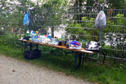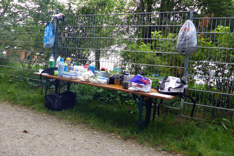 Positiv an einem Sechs-Stundenlauf ist ja, dass man die Verpflegungsstelle in jeder Runde passiert und sich somit die Verpflegung gut einteilen kann und die ist, wie ich es von solchen Läufen nicht anders kenne mehr als ausreichend. Sowohl Getränketechnisch, als auch an fester Nahrung ist alles dabei, was das Läuferherz wünscht. Ich wartete bis nach meinen ersten fünf Kilometern bis ich zum ersten Mal nach einem Getränk und ein paar Sesam-Snacks griff. Die Getränke werden übrigens in festen Plastikbechern gereicht, die man in Körben entsorgen kann. Diese werden regelmäßig wieder eingesammelt, gespült und erneut ausgegeben. Dies finde ich sehr vorbildlich und besser als dieser ganze Einweg-Müll, der oft bei anderen Laufveranstaltungen anfällt. Von nun an plane ich alle drei Runden die Verpflegungsstelle aufzusuchen. Der Kontakt mit meinem Counter funktioniert übrigens auch super. Wir winken uns in jeder Runde zu und er feuert mich auch mit meinem Namen an, so kann ich sicher sein, dass er mich nicht übersehen hat.