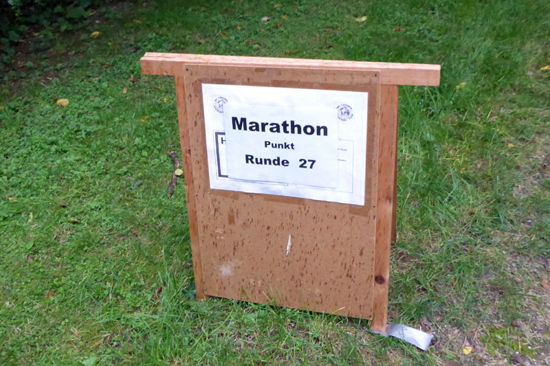 Es läuft und bald habe ich meine ersten 10 Kilometer auf der Uhr, die wie geplant knapp über eine Stunde anzeigt. Ohne weitere Vorkommnisse absolviere ich auch die nächsten 11 Kilometer bis zum Halbmarathon. 2:20 Stunden zeigt die Uhr nun und ich überschlage kurz. Wenn ich die zweite Hälfte bis zum Marathon nur weniger langsam werde, dürfte ich in unter fünf Stunden beim Marathon angelangt sein und hätte dann noch etwas über eine Stunde für die verbleibenden 8 Kilometer bis zur 50-Kilometer-Marke. Charly hatte mich bis dahin schon zweimal überrundet, mir kam sein Tempo etwas hoch vor, aber jeder hat ja seine eigene Taktik. Ich blieb bei meinem Tempo, versuchte auch nicht daran zu denken, dass ich immer noch vier Stunden zu laufen habe. Mein nächstes Ziel waren die 30 Kilometer. Zwischenzeitlich kam ein doch recht frischer Wind auf und ich entschloss mich auf den nächsten Runden umzuziehen. Auch das habe ich aus meinen vergangenen 6-Stundenläufen gelernt. Einfach mal das Laufshirt wechseln. Das gibt einem ein frisches Gefühl und der Wind kommt einen auch gleich nicht mehr so kalt vor. So ging es also im neuen Outfit wieder auf die Strecke und mein Counter erkannte mich dennoch problemlos. Die ersten drei Stunden lagen bald hinter mir.