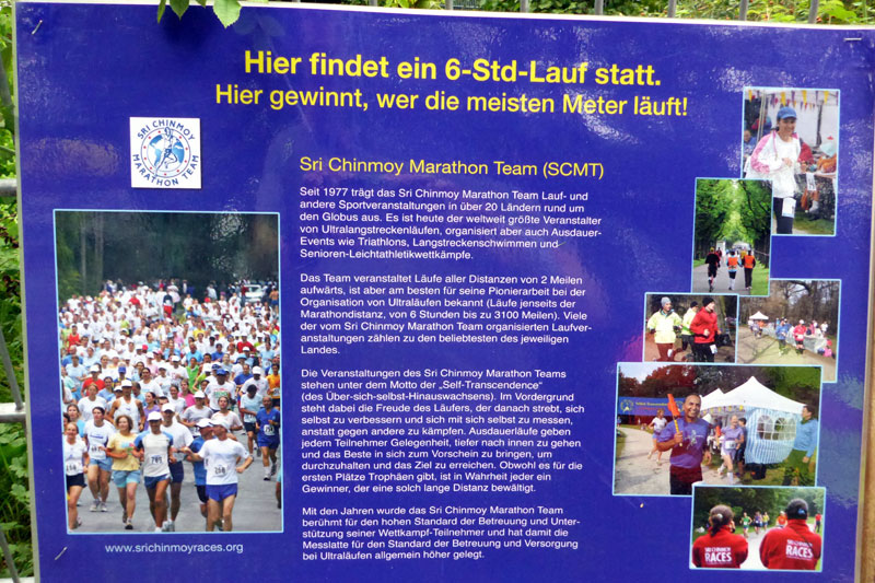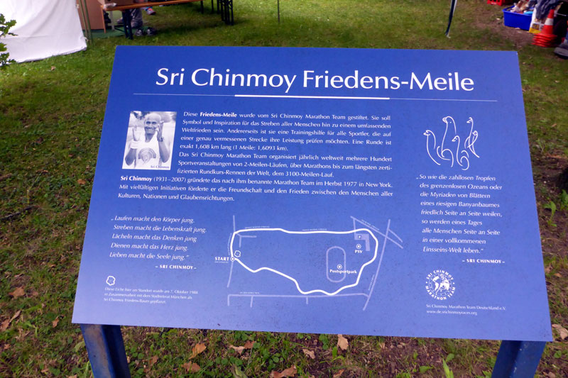 Zum zweiten Mal innerhalb von drei Wochen stehe ich bei einem Lauf am Start, bei dem die Aufgabe relativ einfach ist. Es gilt einfach nur im Kreis zu laufen. Der Sri-Chinmoy Peace-Mile 6-Stundenlauf steht wieder an. Austragungsort ist die Parkanlage um den Post SV im Münchner Ortsteil Moosach. Dort wurde zu Ehren von Sri Chinmoy eine Friedensmeile angelegt, die einmal rund um den Park führt. Eine Runde ist exakt 1580 Meter lang und diese gilt es innerhalb des Zeitlimits von sechs Stunden möglichst oft zu umrunden.