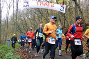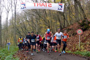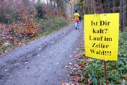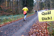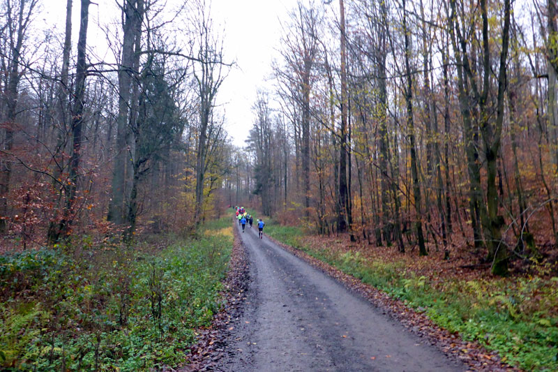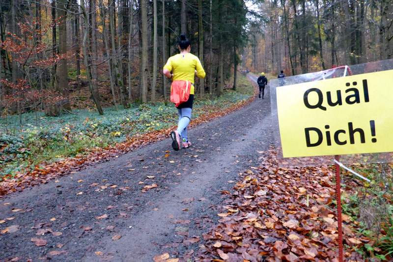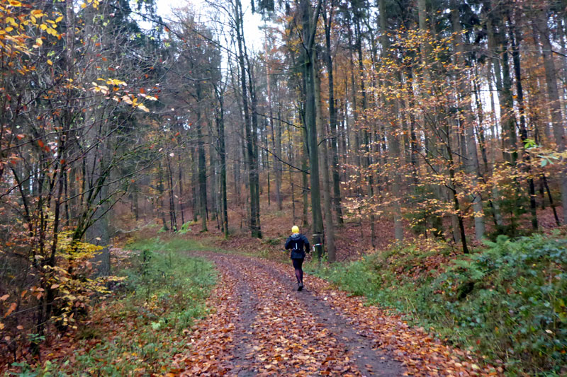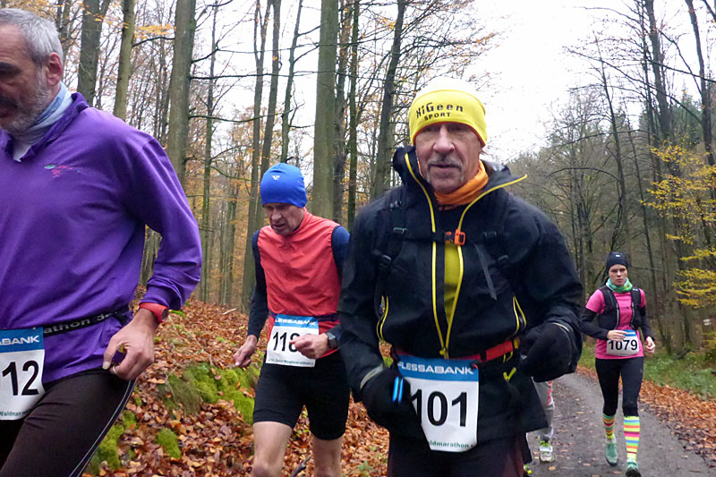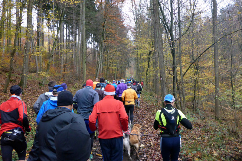 Mit ein paar Minuten Verspätung geht es dann aber endlich los. Ich gehe es, wie die meisten anderen sehr verhalten an, weiß ich doch, was gleich zu Beginn vor uns liegt. Auf den ersten beiden Kilometern gilt es bereits 150 Höhenmeter zu überwinden. So ist es kaum verwunderlich, dass sich das Starterfeld nicht wirklich auseinanderzieht. Der Laubwald um mich herum hat das herbstlich gefärbte Laub schon größtenteils abgeworfen, dennoch bietet er noch genügend für‘s Auge und ich bin auf den ersten Metern schon wieder angetan vom Zeiler Waldmarathon und freu mich auf die kommenden Stunden.