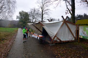 Im Eingang der Veranstaltungshalle gibt es eine kleine Marathonmesse und meine Startnummer habe ich schon nach wenigen Minute in Händen. Dazu gibt es noch eine Flasche alkoholfreies Weißbier der örtlichen Brauerei Göller. Da noch reichlich Zeit ist, gönnen wir uns im Saal noch eine Tasse Kaffee und können wieder einige Lauffreunde begrüßen. Besonders freue ich mich, als Mario den Saal betritt. Nach einer langen Verletzungspause will er nach drei Jahren endlich wieder einen Marathon unter die Füße nehmen. So ist die Zeit recht kurzweilig. Schließlich machen wir uns aber dann doch auf den Weg zum Start. Es ist mit drei Grad noch lausig kalt und ich bin froh, dass ich neben einer Regenjacke, noch Handschuhe und Mütze im Gepäck habe.