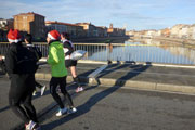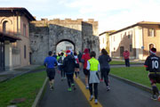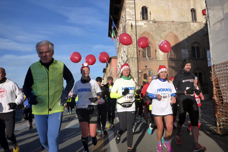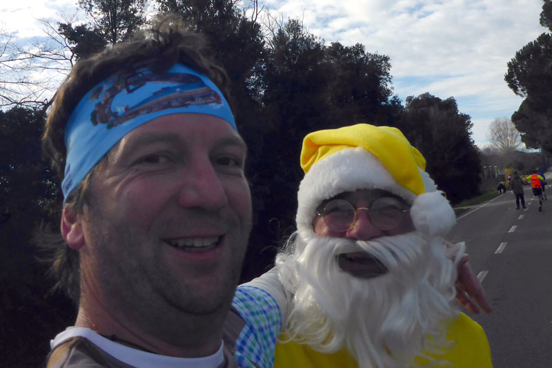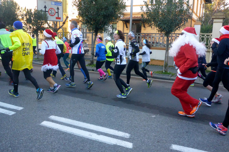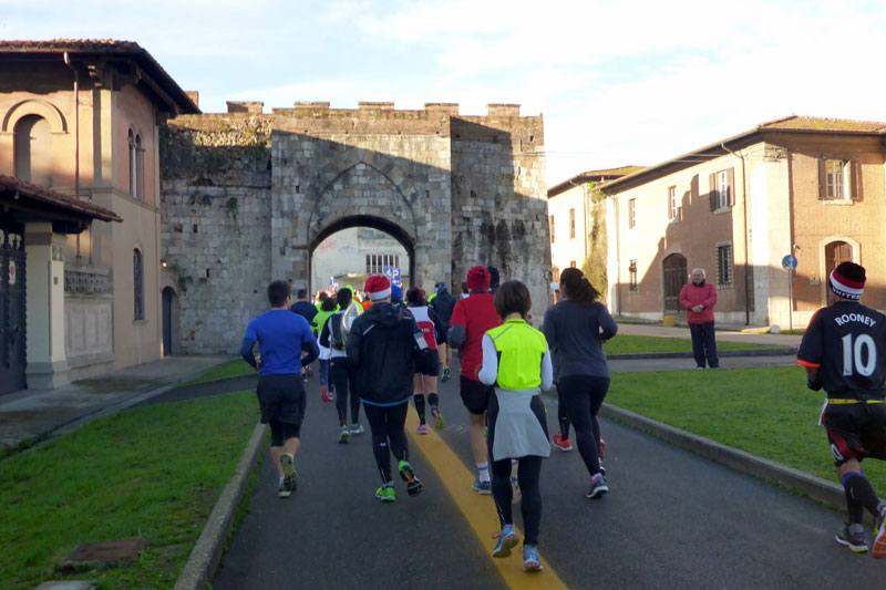 Durch die alte Stadtmauer gleich hinterhalb der Piazza dei Miracoli erreichten wir den Startbereich. Aus allen Richtungen strömten Läufer heran, viele von ihnen mit Nikolausmützen, manche sogar im kompletten Weihnachtsmann-Kostüm inclusive Rauschebart. Es waren nun noch etwa zwanzig Minuten bis zum Start und wir wollten uns in den Startbereich begeben. Das hieß aber auch, dass wir uns von unseren wärmenden Jacken trennen mussten, denn Silke hatte natürlich keinen Zutritt. Am Eingang wurden unsere Startnummern kontrolliert und somit war der Weg für uns frei, auch wenn diesen zwei quergestellte Militär-Jeeps erschwerten. In der Sonne ließ es sich dann doch ganz gut aushalten. Vor allem versprach die Sonne perfektes Laufwetter. Rund 10 Grad sollten es am Ende noch werden.
