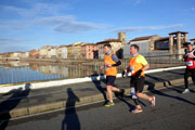 Kurze Zeit laufen wir an der alten Stadtmauer entlang, um kurz vor einer Brücke über den Arno, nach links auf die Piazza di Terzanaia abzubiegen. Rechts von uns befindet sich die Cittadella Vecchia. Nun geht es eine ganze Weile am Arno entlang. Die noch tiefstehende Sonne blendet etwas, dennoch genieße ich diesen Streckenteil ganz besonders. Zur Linken passiere ich teilweise wunderschöne Bauten und zur rechten liegt der Arno. Er ist mit 241 Kilometern der achtlängste Fluss Italiens, wobei wir heute nur wenige Kilometer davon zu Gesicht bekommen werden. Vor mir erkenne ich Rolf Keßler, der wie immer in seinem Clownkostüm unterwegs ist. Ich versuche auf ihn aufzuschließen, was mir jedoch nicht gelingt. Wir befinden uns nun auf Höhe der Ponte di Mezzo, einer Brücke die über den Arno und direkt in die Fußgängerzone Pisas führt.
