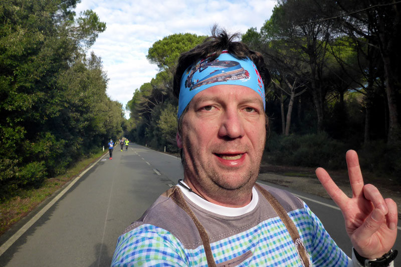 Die nächste Verpflegungsstelle wartet bei Kilometer 15 auf uns. Dort ist richtig Stimmung, denn offensichtlich kennen sich Läufer und Helfer. Da ich mehrmals das Wort „Birra“ und Gelächter vernehmen konnte, ging ich mal davon aus, dass ein Helfer versuchte einen Freund zum Frühschoppen zu überreden. Als er mich sah – ich lief heute in „Tracht“ – hellte sich sein Blick auf und ich konnte, als ich als Bayer enttarnt war, einfach nicht nein sagen. Ein halber Becher Birra und weiter ging‘s. Vor mir lag nun ein herrlicher Pinienwald, dessen Schatten ich heute zwar nicht gebraucht hätte, aber trotzdem genoss ich jeden Meter zwischen den Bäumen. Zwischen grünen Wiesen näherten wir uns nun endgültig dem Marina di Pisa. Als wir die Küstenstraße erreicht haben, biegen wir erst mal nach links ab und laufen in Richtung Süden. Rechts von uns befinden sich die Eingänge zu den unterschiedlichen Badestränden. Meine Welt wäre das im Sommer sicher nicht, aber heute brauche ich mir eh keine Gedanken über einen Strandbesuch zu machen. Erstens habe ich noch etliche Kilometer vor mir und zweitens ist eh zu kalt, obwohl wir uns inzwischen sicherlich dem zweistelligen Bereich nähern.
