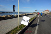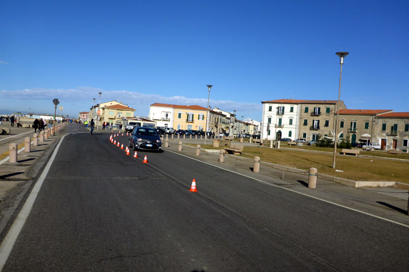 Die Gerade war aber noch lange nicht zu Ende. Weitere acht Kilometer ging es am Ende der Begegnungsstrecke weiter geradeaus. Aber wir hatten nun einen tollen Blick auf das Meer. Das hatte schon was. Zahlreiche Touristen und auch Einheimische nutzten den sonnigen Tag für einen Spaziergang am Meer, straften uns jedoch mit Missachtung. Beifall oder Zuspruch erhielten wir von ihnen nicht. Immerhin machten sie stets zur rechten Zeit den Weg frei und zwangen uns keine zusätzlichen Meter auf. Am Ende der Gerade durchliefen wir eine Rechtskurve und links von uns lagen nun die zahlreichen Yachten im Marina di Pisa. Wir hatten nun wieder Gegenverkehr. Nur leider nicht mehr durch Läufer. Die Gegenspur war für den Autoverkehr freigegeben und offensichtlich suchten einige Menschen den Weg ans Meer. Immerhin konnte ich unter den Fahrzeugen ein paar Schätzchen entdecken. Vor allem drei Lancia Delta Integrale 16V in Folge ließen mein Oldtimerherz höherschlagen.