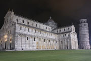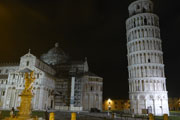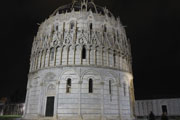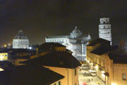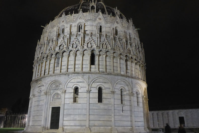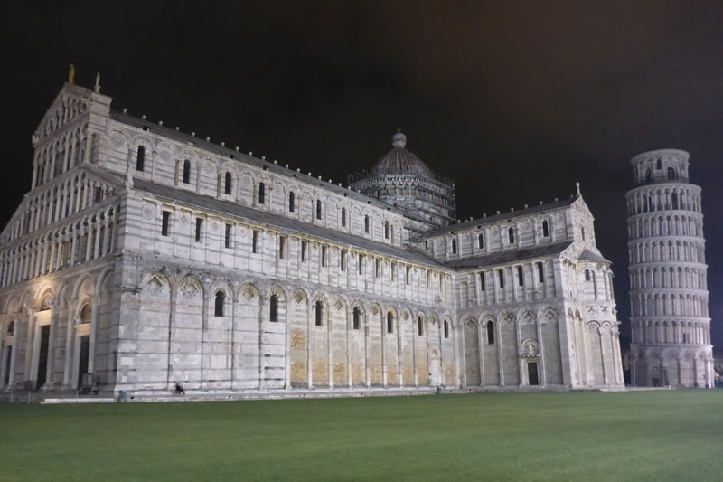 Obwohl der Torre pendent alleine wohl schon Touristenmagnet genug wäre, steht gleich links daneben noch ein weiteres beeindruckendes Bauwerk. Der Domo Santa Maria Assunta galt lange Zeit als der monumentalste Bau der christlichen Welt. Er war nahezu allen Kathedralen in der Toscana ein Vorbild. Die Fassade wurde in der ersten Hälfte des 12. Jahrhunderts gebaut und beeindruckte neben ihren gewaltigen Ausmaßen vor allem mit den vier Loggien-Geschossen. Links neben dem Dom kann ich auch das Baptisterium erkennen, es handelt sich um die größte Taufkapelle der Welt. Das Ensemble dieser drei Gebäude wird um diese Uhrzeit mit dezentem Licht erhellt und lässt mich einige Minuten auf dem Balkon verharren.