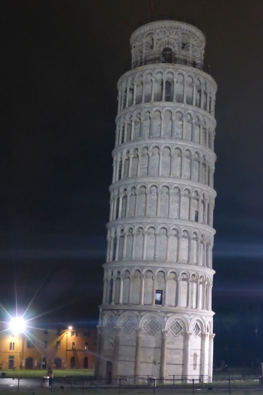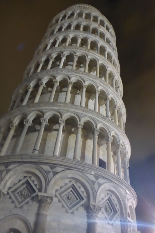 Wir sind im vierten Stock des Grand Hotel Duomo untergebracht und unser Zimmer verfügt über einen kleinen Balkon. Obwohl es inzwischen schon dunkel war, führte mein erster Weg auf den Balkon, um die Aussicht zu prüfen. Im ersten Moment dachte ich, vor einer Fototapete zu stehen. Die Piazza dei Miracoli, zu Deutsch „Wunderwiese“, lag keine 300 Meter Luftlinie entfernt. Der Name ist, wie ich finde, auch nicht zu hoch gegriffen. Rechts ragt der Torre pendente, besser bekannt als der Schiefe Turm von Pisa rund 55 Meter in die Höhe. Bereits zum Beginn seiner Bauzeit um 1173 neigte sich der Turm, da der Untergrund aus Schwemmland des Arnos bestand und dieser sofort nachgab. Deshalb wurde der Bau auch nach der Fertigstellung des dritten Stockwerks eingestellt.