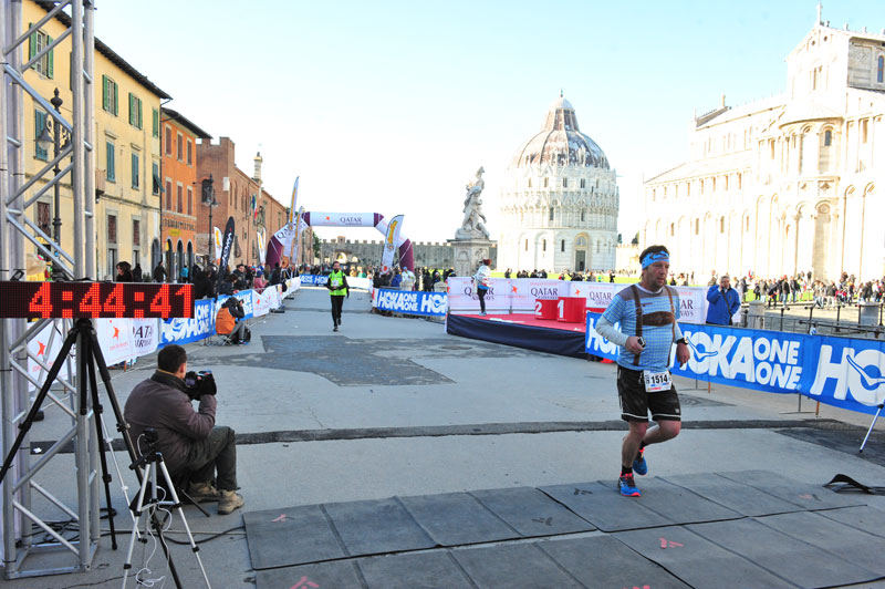Unbemerkt erreichten wir so wieder Pisa und ich konnte es kaum glauben. Es lagen nur noch drei Kilometer vor mir. Wir überquerten den Arno auf der Ponte di Cittadella und schon hatte ich wieder Orientierung. Nur noch etwas am Arno entlang, dann durch die Borgo Stretto und schon bald würde ich den Torre Pendente, alias Schiefer Turm von Pisa vor mir sehen können. Das verleiht Flügel. Das war auch dringend notwendig, denn kurzfristig hatten sie die drei Mädels mit ihrem 4:45-Stunden-Ballon an mir vorbeigeschoben. So viel Ehrgeiz hatte ich dann doch noch und ich nahm ihnen bis ins Ziel nochmal drei Minuten ab.