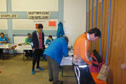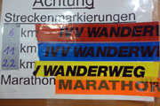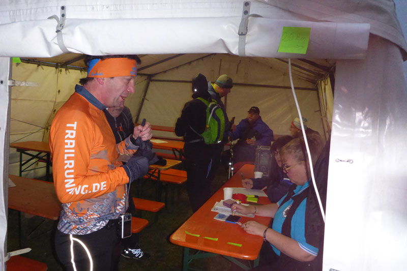 Da wir ja nun wirklich einen kurzen Anfahrtsweg haben, standen wir schon um kurz nach sieben Uhr in der Hattenhofener Sporthalle um uns dort unsere Startunterlagen abzuholen. Schon beim Betreten der Halle wurden wir durch die Verantwortlichen freudig mit einem „ah, da seid's ja wieder!“ begrüßt. Man erkennt uns unter den vielen Wanderern natürlich leicht an unserem sportlichen Outfit. Dass der Wandermarathon auch laufend bezwungen wird, ist bei den Naturwanderfreunden Haspelmoor nämlich genauso willkommen, wie das Wandern selbst. Die laufenden Teilnehmer dürften jedoch an zehn Fingern abzuzählen sein, was uns also gewissermaßen einen Sonderstatus einräumt. Wir berappen noch schnell die Startgebühr von 7,50 Euro, womit uns die Kontrollkarte ausgehändigt wird. Beim Erreichen des Ziels gibt`s noch eine Teilnahmeurkunde und einen tollen Aufnäher, dessen Motive sich bei jeder Austragung ändern. In diesem Jahr ist es der Bussard, der sich zu meinem Biber gesellen darf. Für Verpflegung unterwegs ist ebenfalls gesorgt. Es gibt Wasser, heißen Tee und ab und an auch ein paar Häppchen, die auch für einen Lauf ausreichend sind.